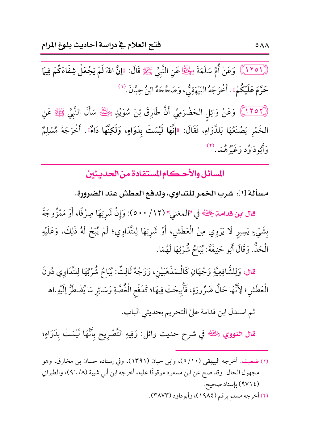 ١٢٥٢ - وَعَنْ وَائِلٍ الحَضْرَمِيِّ أَنَّ طَارِقَ بْنَ سُوَيْدٍ -رضي الله عنه- سَأَلَ النَّبِيَّ - صلى الله عليه وسلم - عَنِ الخَمْرِ يَصْنَعُهَا لِلدَّوَاءِ، فَقَالَ: «إنَّهَا لَيْسَتْ بِدَوَاءٍ، وَلَكِنَّهَا دَاءٌ». أَخْرَجَهُ مُسْلِمٌ وَأَبُودَاوُد وَغَيْرُهُمَا. (¬٢)