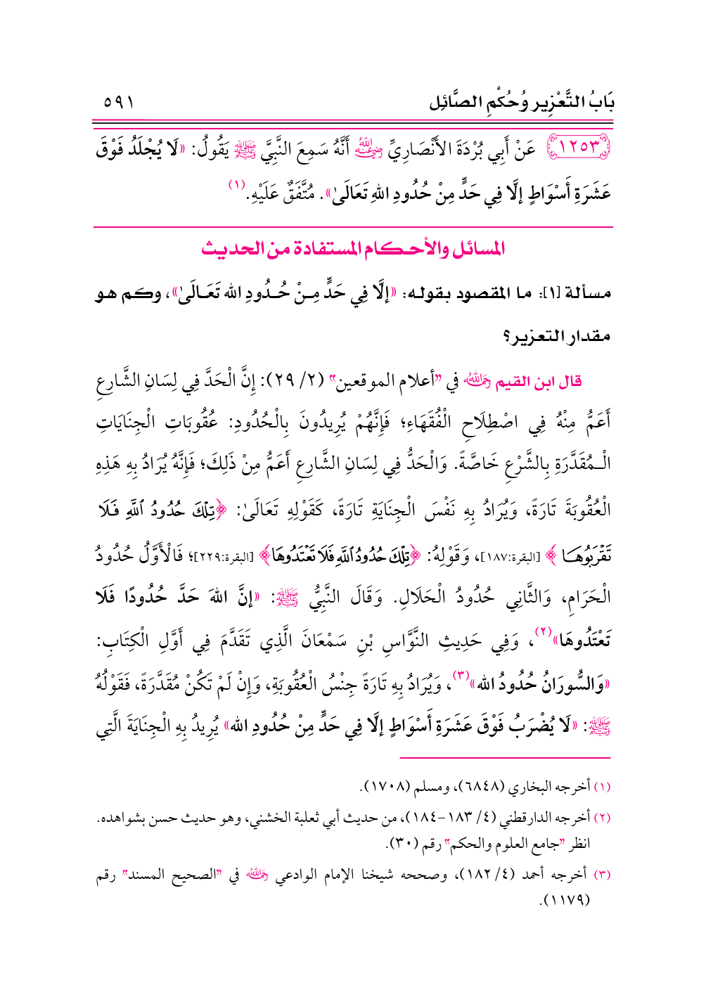 قال ابن القيم -رحمه الله- في «أعلام الموقعين» (٢/ ٢٩): إِنَّ الْحَدَّ فِي لِسَانِ الشَّارِعِ أَعَمُّ مِنْهُ فِي اصْطِلَاحِ الْفُقَهَاءِ؛ فَإِنَّهُمْ يُرِيدُونَ بِالْحُدُودِ: عُقُوبَاتِ الْجِنَايَاتِ الْمُقَدَّرَةِ بِالشَّرْعِ خَاصَّةً. وَالْحَدُّ فِي لِسَانِ الشَّارِعِ أَعَمُّ مِنْ ذَلِكَ؛ فَإِنَّهُ يُرَادُ بِهِ هَذِهِ الْعُقُوبَةَ تَارَةً، وَيُرَادُ بِهِ نَفْسَ الْجِنَايَةِ تَارَةً، كَقَوْلِهِ تَعَالَى: {تِلْكَ حُدُودُ اللَّهِ فَلَا تَقْرَبُوهَا} [البقرة:١٨٧]، وَقَوْلِهُ: {تِلْكَ حُدُودُ اللَّهِ فَلَا تَعْتَدُوهَا} [البقرة:٢٢٩]؛ فَالْأَوَّلُ حُدُودُ الْحَرَامِ، وَالثَّانِي حُدُودُ الْحَلَالِ. وَقَالَ النَّبِيُّ - صلى الله عليه وسلم -: «إنَّ اللهَ حَدَّ حُدُودًا فَلَا تَعْتَدُوهَا» (¬٢)، وَفِي حَدِيثِ النَّوَّاسِ بْنِ سَمْعَانَ الَّذِي تَقَدَّمَ فِي أَوَّلِ الْكِتَابِ: «وَالسُّورَانُ حُدُودُ الله» (¬٣)، وَيُرَادُ بِهِ تَارَةً جِنْسُ الْعُقُوبَةِ، وَإِنْ لَمْ تَكُنْ مُقَدَّرَةً، فَقَوْلُهُ - صلى الله عليه وسلم -: «لَا يُضْرَبُ فَوْقَ عَشَرَةِ أَسْوَاطٍ إلَّا فِي حَدٍّ مِنْ حُدُودِ الله» يُرِيدُ بِهِ الْجِنَايَةَ الَّتِي