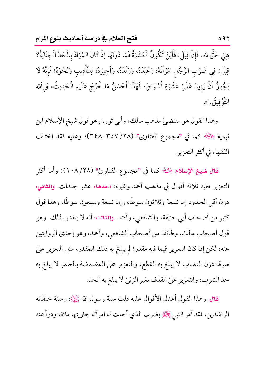 قال شيخ الإسلام -رحمه الله- كما في «مجموع الفتاوى» (٢٨/ ١٠٨): وأما أكثر التعزير ففيه ثلاثة أقوال في مذهب أحمد وغيره: أحدها: عشر جلدات. والثاني: دون أقل الحدود إما تسعة وثلاثون سوطًا، وإما تسعة وسبعون سوطًا، وهذا قول كثير من أصحاب أبي حنيفة، والشافعي، وأحمد. والثالث: أنه لا يتقدر بذلك. وهو قول أصحاب مالك، وطائفة من أصحاب الشافعي، وأحمد، وهو إحدى الروايتين عنه، لكن إن كان التعزير فيما فيه مقدر؛ لم يبلغ به ذلك المقدر، مثل التعزير على سرقة دون النصاب لا يبلغ به القطع، والتعزير على المضمضة بالخمر لا يبلغ به حد الشرب، والتعزير على القذف بغير الزنى لا يبلغ به الحد.