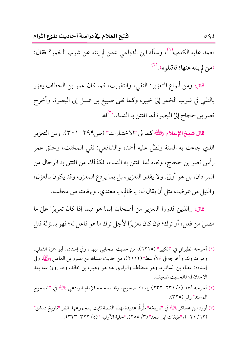 قال: ومن أنواع التعزير: النفي، والتغريب، كما كان عمر بن الخطاب يعزر بالنفي في شرب الخمر إلى خيبر، وكما نفى صبيغ بن عسل إلى البصرة، وأخرج نصر بن حجاج إلى البصرة لما افتتن به النساء. (¬٣) اهـ