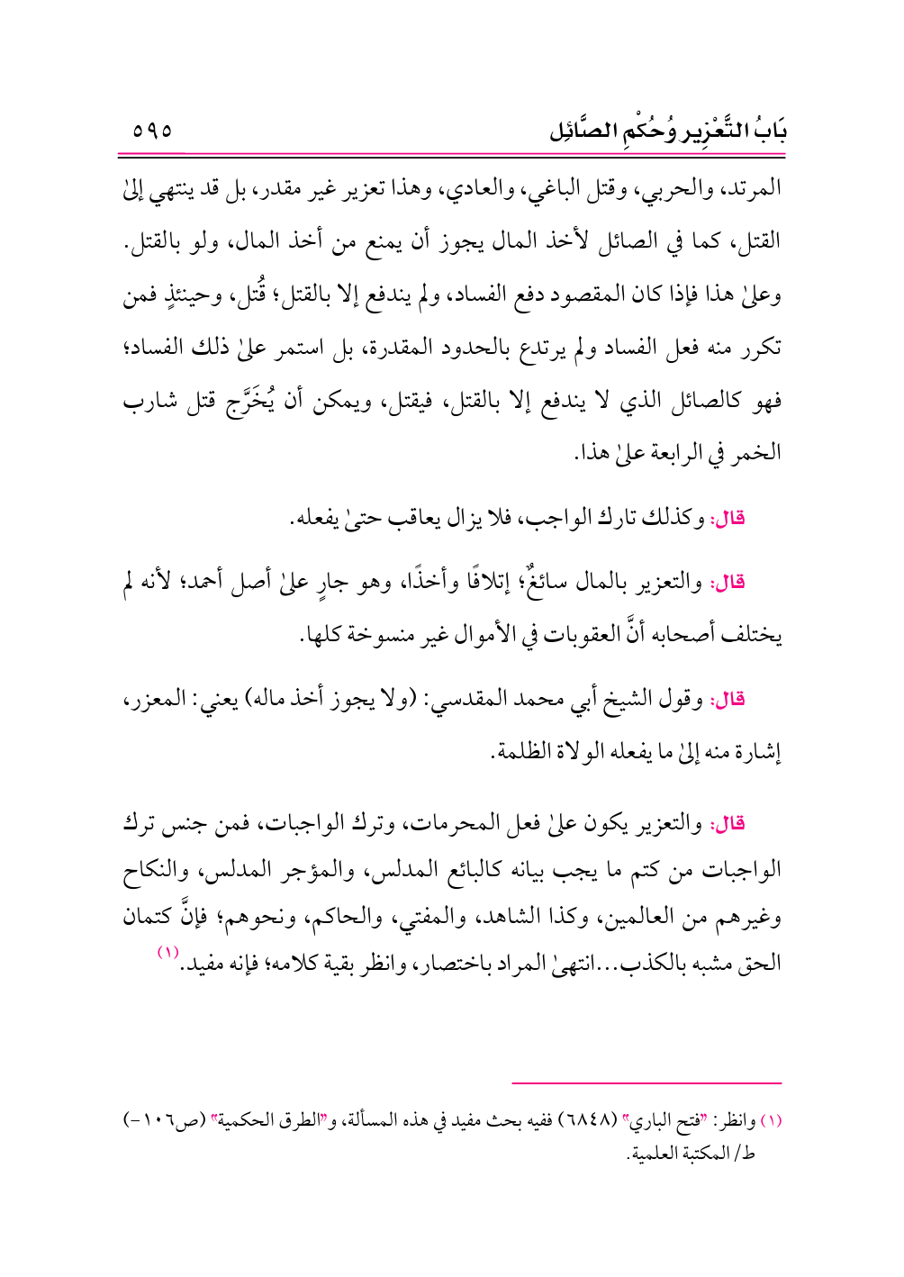 المرتد، والحربي، وقتل الباغي، والعادي، وهذا تعزير غير مقدر، بل قد ينتهي إلى القتل، كما في الصائل لأخذ المال يجوز أن يمنع من أخذ المال، ولو بالقتل. وعلى هذا فإذا كان المقصود دفع الفساد، ولم يندفع إلا بالقتل؛ قُتل، وحينئذٍ فمن تكرر منه فعل الفساد ولم يرتدع بالحدود المقدرة، بل استمر على ذلك الفساد؛ فهو كالصائل الذي لا يندفع إلا بالقتل، فيقتل، ويمكن أن يُخَرَّج قتل شارب الخمر في الرابعة على هذا.