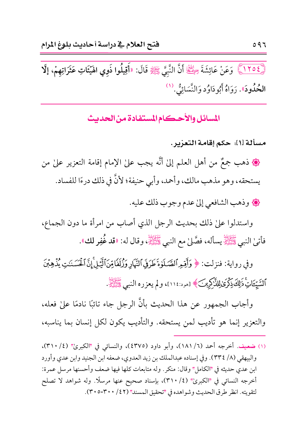 ١٢٥٤ - وَعَنْ عَائِشَةَ -رضي الله عنها- أَنَّ النَّبِيَّ - صلى الله عليه وسلم - قَالَ: «أَقِيلُوا ذَوِي الهَيْئَاتِ عَثَرَاتِهِمْ، إلَّا الحُدُودَ». رَوَاهُ أَبُودَاوُد وَالنَّسَائِيُّ. (¬١)
