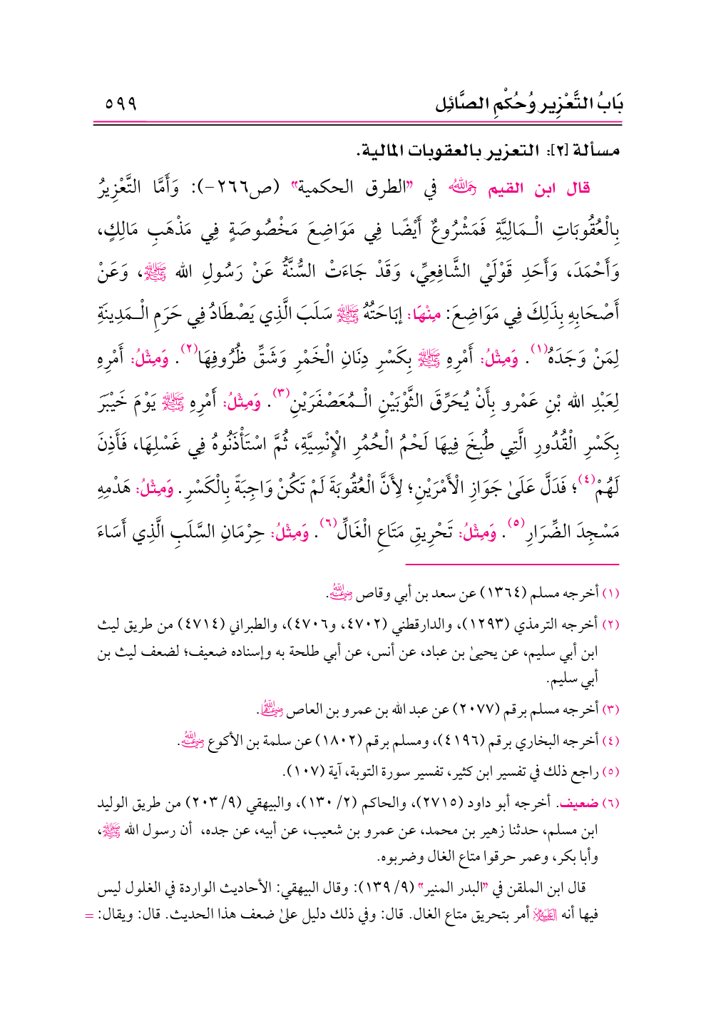 قال ابن القيم -رحمه الله- في «الطرق الحكمية» (ص ٢٦٦ - ): وَأَمَّا التَّعْزِيرُ بِالْعُقُوبَاتِ الْمَالِيَّةِ فَمَشْرُوعٌ أَيْضًا فِي مَوَاضِعَ مَخْصُوصَةٍ فِي مَذْهَبِ مَالِكٍ، وَأَحْمَدَ، وَأَحَدِ قَوْلَيْ الشَّافِعِيِّ، وَقَدْ جَاءَتْ السُّنَّةُ عَنْ رَسُولِ الله - صلى الله عليه وسلم -، وَعَنْ أَصْحَابِهِ بِذَلِكَ فِي مَوَاضِعَ: مِنْهَا: إبَاحَتُهُ - صلى الله عليه وسلم - سَلَبَ الَّذِي يَصْطَادُ فِي حَرَمِ الْمَدِينَةِ لِمَنْ وَجَدَهُ (¬١). وَمِثْلُ: أَمْرِهِ - صلى الله عليه وسلم - بِكَسْرِ دِنَانِ الْخَمْرِ وَشَقِّ ظُرُوفِهَا (¬٢). وَمِثْلُ: أَمْرِهِ لِعَبْدِ الله بْنِ عَمْرو بِأَنْ يُحَرِّقَ الثَّوْبَيْنِ الْمُعَصْفَرَيْنِ (¬٣). وَمِثْلُ: أَمْرِهِ - صلى الله عليه وسلم - يَوْمَ خَيْبَرَ بِكَسْرِ الْقُدُورِ الَّتِي طُبِخَ فِيهَا لَحْمُ الْحُمُرِ الْإِنْسِيَّةِ، ثُمَّ اسْتَأْذَنُوهُ فِي غَسْلِهَا، فَأَذِنَ لَهُمْ (¬٤)؛ فَدَلَّ عَلَى جَوَازِ الْأَمْرَيْنِ؛ لِأَنَّ الْعُقُوبَةَ لَمْ تَكُنْ وَاجِبَةً بِالْكَسْرِ. وَمِثْلُ: هَدْمِهِ مَسْجِدَ الضِّرَارِ (¬٥). وَمِثْلُ: تَحْرِيقِ مَتَاعِ الْغَالِّ (¬٦).