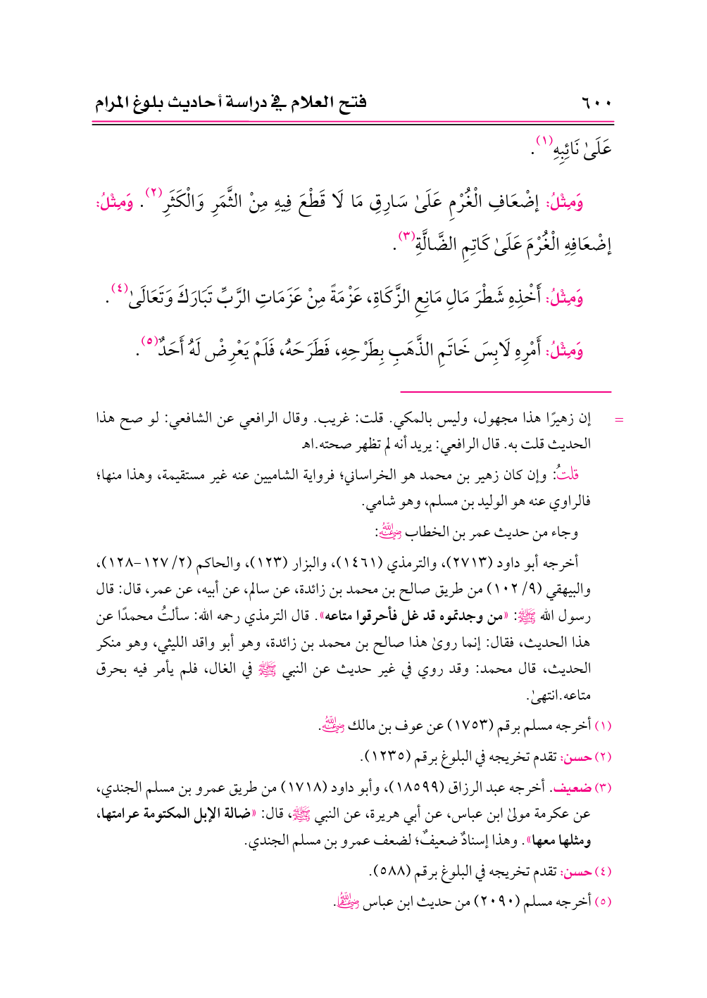 (¬٣) ضعيف. أخرجه عبد الرزاق (١٨٥٩٩)، وأبو داود (١٧١٨) من طريق عمرو بن مسلم الجندي، عن عكرمة مولى ابن عباس، عن أبي هريرة، عن النبي - صلى الله عليه وسلم -، قال: «ضالة الإبل المكتومة عرامتها، ومثلها معها». وهذا إسنادٌ ضعيفٌ؛ لضعف عمرو بن مسلم الجندي.
