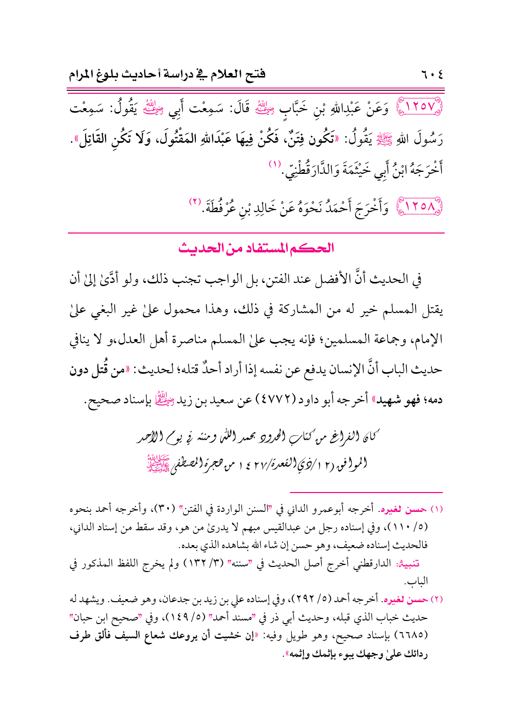 ١٢٥٧ - وَعَنْ عَبْدِاللهِ بْنِ خَبَّابٍ -رضي الله عنه- قَالَ: سَمِعْت أَبِي -رضي الله عنه- يَقُولُ: سَمِعْت رَسُولَ اللهِ - صلى الله عليه وسلم - يَقُولُ: «تَكُون فِتَنٌ، فَكُنْ فِيهَا عَبْدَاللهِ المَقْتُولَ، وَلَا تَكُنِ القَاتِلَ». أَخْرَجَهُ ابْنُ أَبِي خَيْثَمَةَ وَالدَّارَقُطْنِيّ. (¬١)