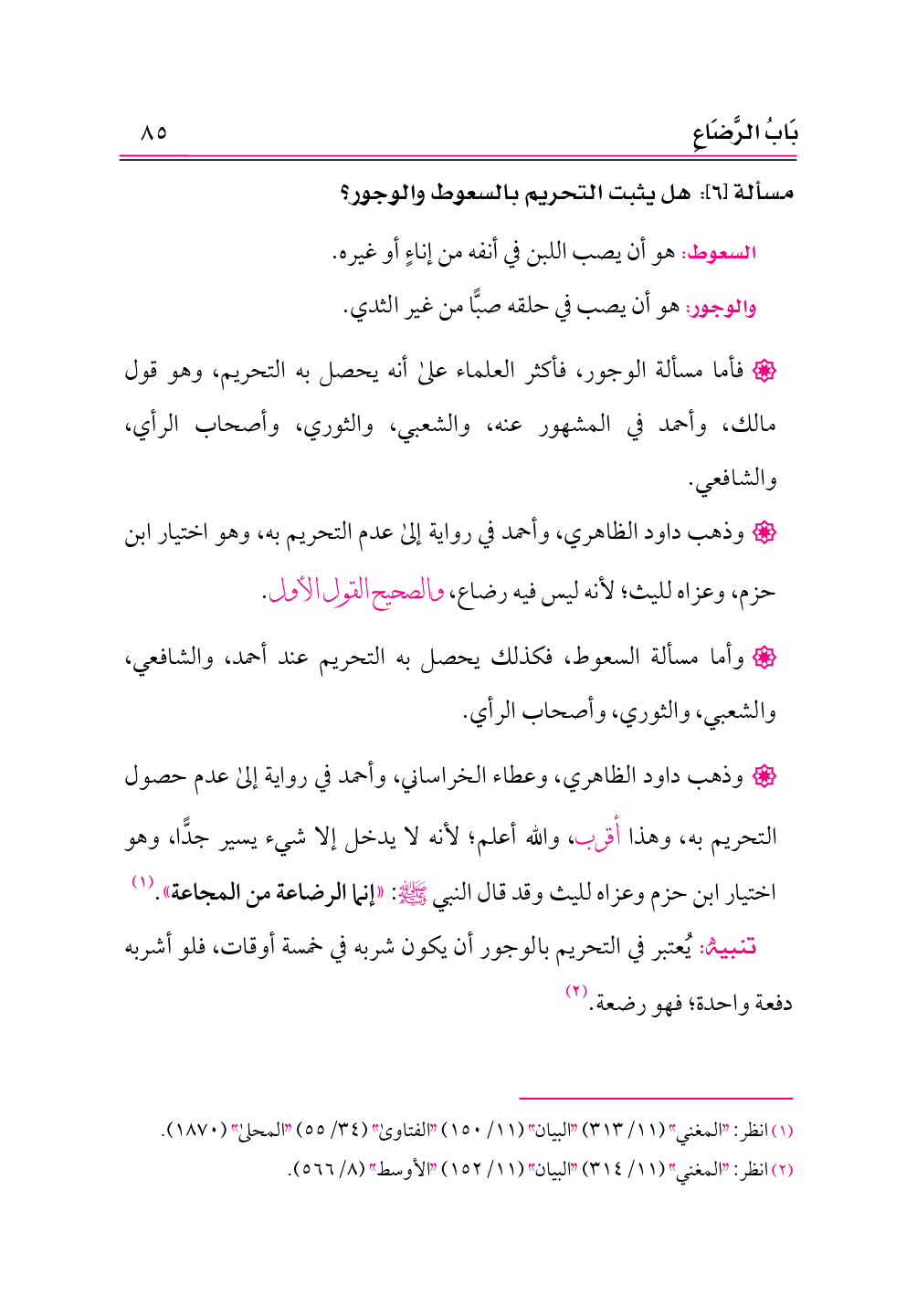 • وأما مسألة السعوط، فكذلك يحصل به التحريم عند أحمد، والشافعي، والشعبي، والثوري، وأصحاب الرأي.