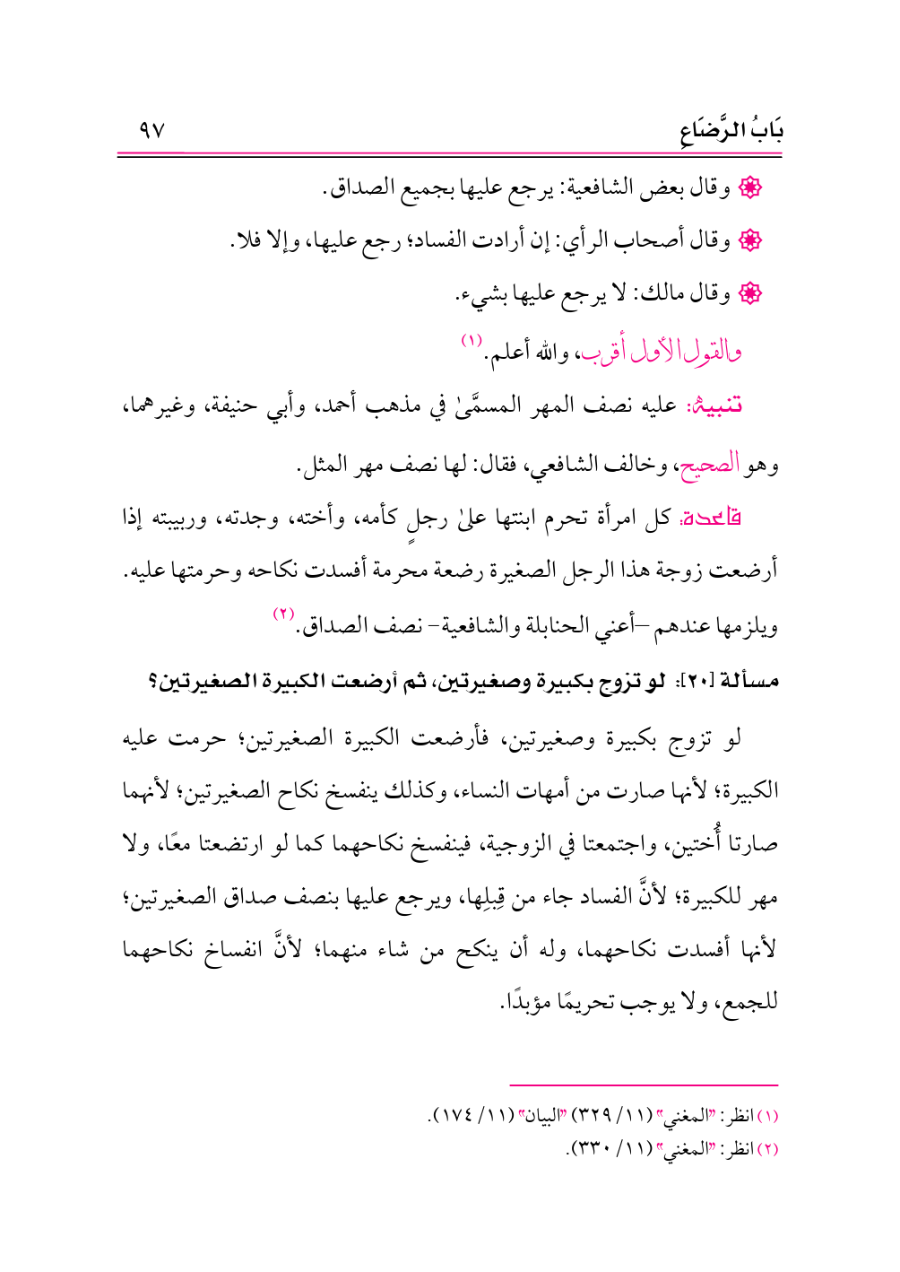 قاعدة: كل امرأة تحرم ابنتها على رجلٍ كأمه، وأخته، وجدته، وربيبته إذا أرضعت زوجة هذا الرجل الصغيرة رضعة محرمة أفسدت نكاحه وحرمتها عليه. ويلزمها عندهم -أعني الحنابلة والشافعية- نصف الصداق. (¬٢)