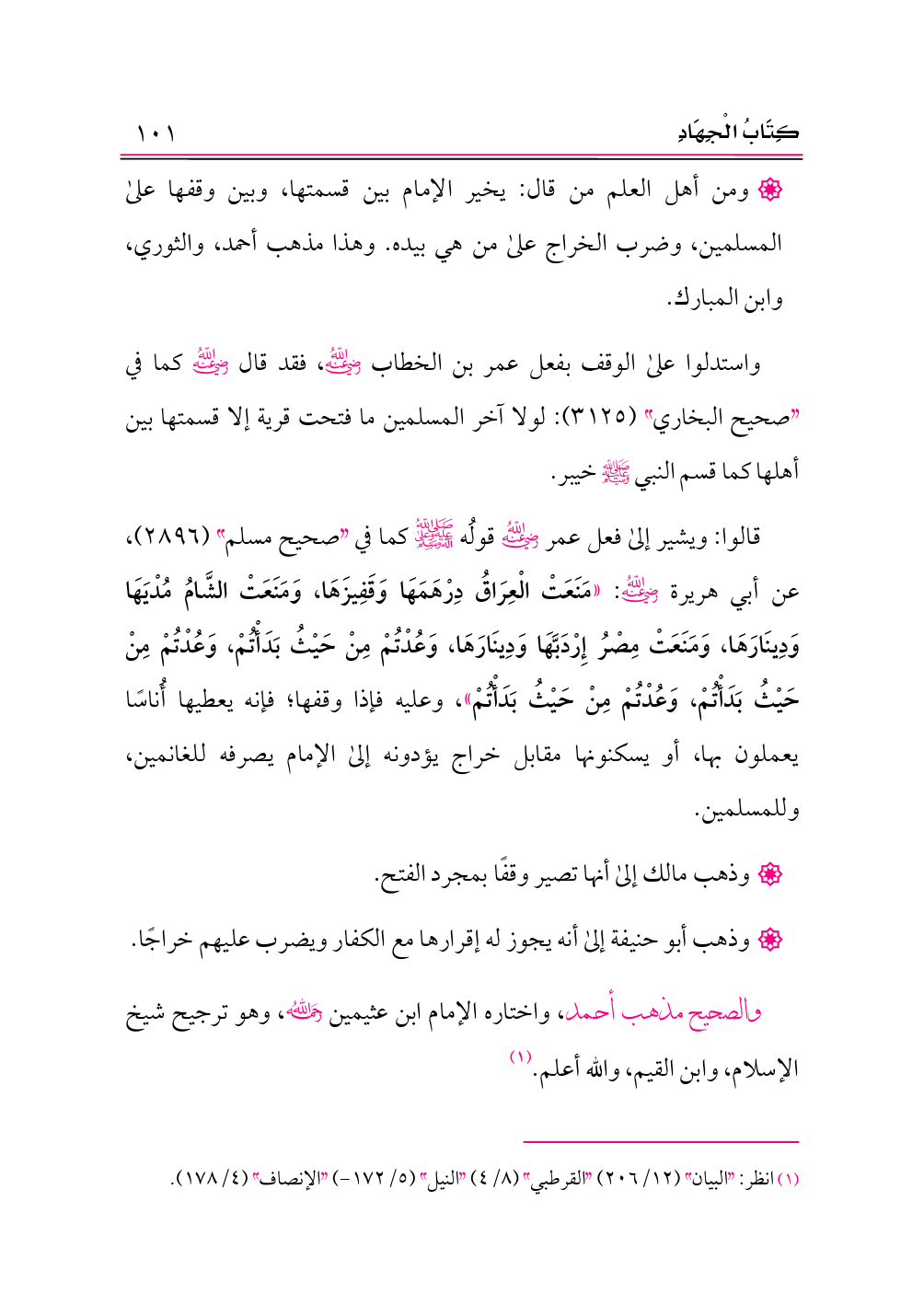 قالوا: ويشير إلى فعل عمر -رضي الله عنه- قولُه -صلى الله عليه وعلى آله وسلم- كما في «صحيح مسلم» (٢٨٩٦)، عن أبي هريرة -رضي الله عنه-: «مَنَعَتْ الْعِرَاقُ دِرْهَمَهَا وَقَفِيزَهَا، وَمَنَعَتْ الشَّامُ مُدْيَهَا وَدِينَارَهَا، وَمَنَعَتْ مِصْرُ إِرْدَبَّهَا وَدِينَارَهَا، وَعُدْتُمْ مِنْ حَيْثُ بَدَأْتُمْ، وَعُدْتُمْ مِنْ حَيْثُ بَدَأْتُمْ، وَعُدْتُمْ مِنْ حَيْثُ بَدَأْتُمْ»، وعليه فإذا وقفها؛ فإنه يعطيها أُناسًا يعملون بها، أو يسكنونها مقابل خراج يؤدونه إلى الإمام يصرفه للغانمين، وللمسلمين.