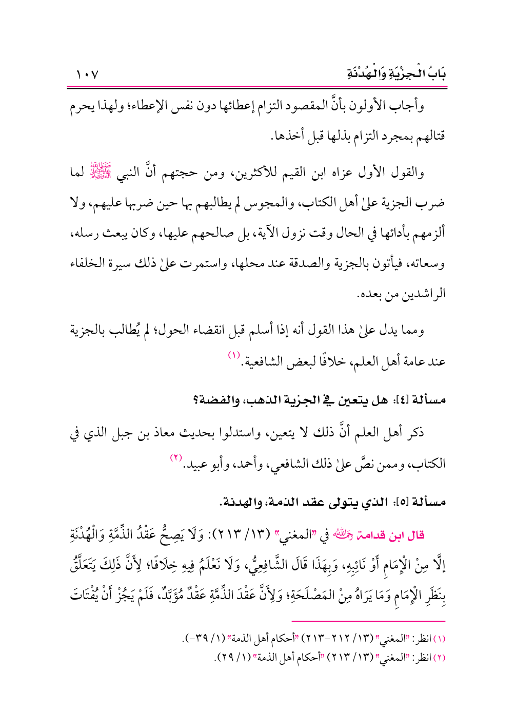والقول الأول عزاه ابن القيم للأكثرين، ومن حجتهم أنَّ النبي -صلى الله عليه وعلى آله وسلم- لما ضرب الجزية على أهل الكتاب، والمجوس لم يطالبهم بها حين ضربها عليهم، ولا ألزمهم بأدائها في الحال وقت نزول الآية، بل صالحهم عليها، وكان يبعث رسله، وسعاته، فيأتون بالجزية والصدقة عند محلها، واستمرت على ذلك سيرة الخلفاء الراشدين من بعده.
