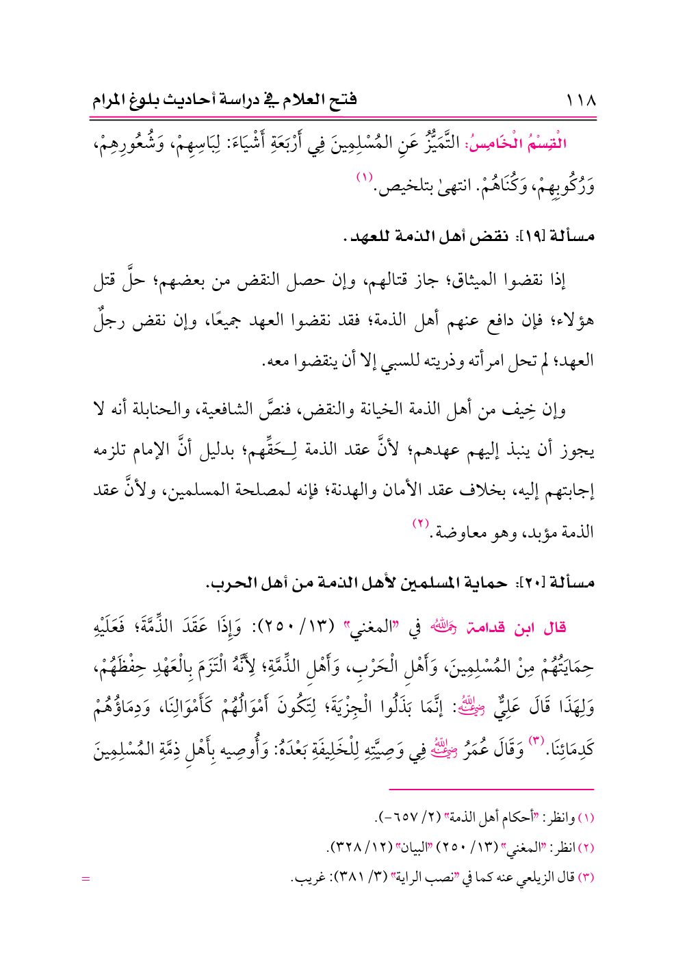 قال ابن قدامة -رحمه الله- في «المغني» (١٣/ ٢٥٠): وَإِذَا عَقَدَ الذِّمَّةَ؛ فَعَلَيْهِ حِمَايَتُهُمْ مِنْ المُسْلِمِينَ، وَأَهْلِ الْحَرْبِ، وَأَهْلِ الذِّمَّةِ؛ لِأَنَّهُ الْتَزَمَ بِالْعَهْدِ حِفْظَهُمْ، وَلِهَذَا قَالَ عَلِيٌّ -رضي الله عنه-: إنَّمَا بَذَلُوا الْجِزْيَةَ؛ لِتَكُونَ أَمْوَالُهُمْ كَأَمْوَالِنَا، وَدِمَاؤُهُمْ كَدِمَائِنَا. (¬٣) وَقَالَ عُمَرُ -رضي الله عنه- فِي وَصِيَّتِهِ لِلْخَلِيفَةِ بَعْدَهُ: وَأُوصِيه بِأَهْلِ ذِمَّةِ المُسْلِمِينَ