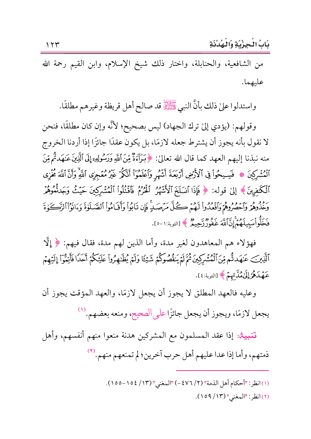 وقولهم: (يؤدي إلى ترك الجهاد) ليس بصحيح؛ لأنَّه وإن كان مطلقًا، فنحن لا نقول بأنه يجوز أن يشترط جعله لازمًا، بل يكون عقدًا جائزًا إذا أردنا الخروج منه نبذنا إليهم العهد كما قال الله تعالى: {بَرَاءَةٌ مِنَ اللَّهِ وَرَسُولِهِ إِلَى الَّذِينَ عَاهَدْتُمْ مِنَ الْمُشْرِكِينَ * فَسِيحُوا فِي الْأَرْضِ أَرْبَعَةَ أَشْهُرٍ وَاعْلَمُوا أَنَّكُمْ غَيْرُ مُعْجِزِي اللَّهِ وَأَنَّ اللَّهَ مُخْزِي الْكَافِرِينَ} إلى قوله: {فَإِذَا انْسَلَخَ الْأَشْهُرُ الْحُرُمُ فَاقْتُلُوا الْمُشْرِكِينَ حَيْثُ وَجَدْتُمُوهُمْ وَخُذُوهُمْ وَاحْصُرُوهُمْ وَاقْعُدُوا لَهُمْ كُلَّ مَرْصَدٍ فَإِنْ تَابُوا وَأَقَامُوا الصَّلَاةَ وَآتَوُا الزَّكَاةَ فَخَلُّوا سَبِيلَهُمْ إِنَّ اللَّهَ غَفُورٌ رَحِيمٌ} [التوبة:١ - ٥].