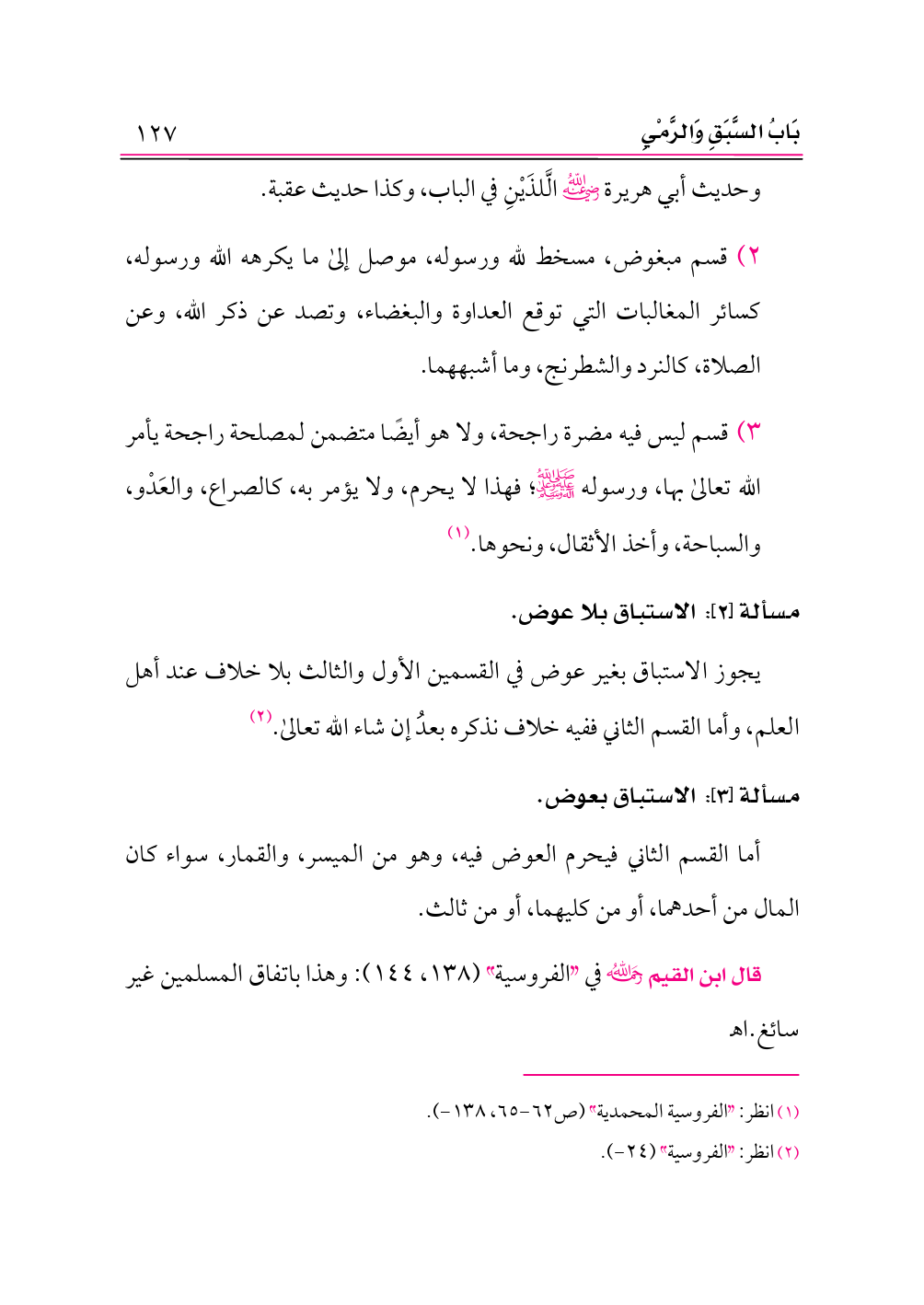 يجوز الاستباق بغير عوض في القسمين الأول والثالث بلا خلاف عند أهل العلم، وأما القسم الثاني ففيه خلاف نذكره بعدُ إن شاء الله تعالى. (¬٢)