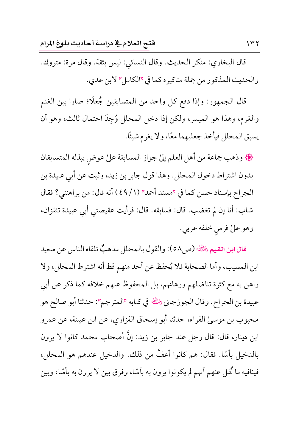قال ابن القيم -رحمه الله- (ص ٥٨): والقول بالمحلل مذهبٌ تلقاه الناس عن سعيد ابن المسيب، وأما الصحابة فلا يُحفظ عن أحد منهم قط أنه اشترط المحلل، ولا راهن به مع كثرة تناضلهم ورهانهم، بل المحفوظ عنهم خلافه كما ذكر عن أبي عبيدة بن الجراح. وقال الجوزجاني -رحمه الله- في كتابه «المترجم»: حدثنا أبو صالح هو محبوب بن موسى الفراء، حدثنا أبو إسحاق الفزاري، عن ابن عيينة، عن عمرو ابن دينار، قال: قال رجل عند جابر بن زيد: إنَّ أصحاب محمد كانوا لا يرون بالدخيل بأسًا. فقال: هم كانوا أعفَّ من ذلك. والدخيل عندهم هو المحلل، فينافيه ما نُقل عنهم أنهم لم يكونوا يرون به بأسًا، وفرق بين لا يرون به بأسًا، وبين
