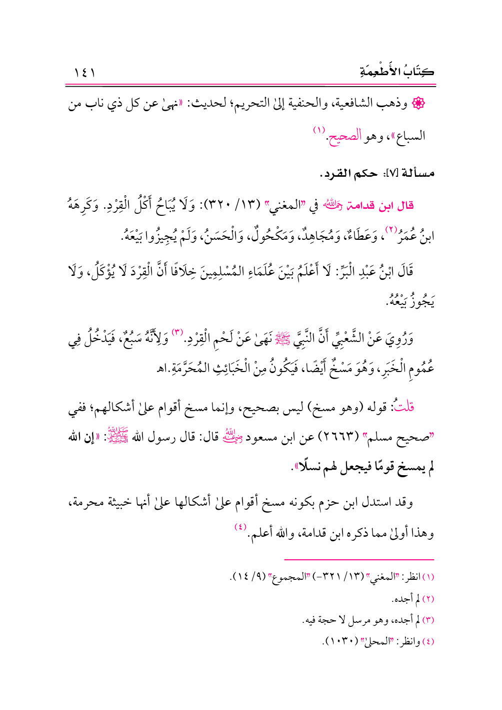 قال ابن قدامة -رحمه الله- في «المغني» (١٣/ ٣٢٠): وَلَا يُبَاحُ أَكْلُ الْقِرْدِ. وَكَرِهَهُ ابنُ عُمَرُ (¬٢)، وَعَطَاءٌ، وَمُجَاهِدٌ، وَمَكْحُولٌ، وَالْحَسَنُ، وَلَمْ يُجِيزُوا بَيْعَهُ.