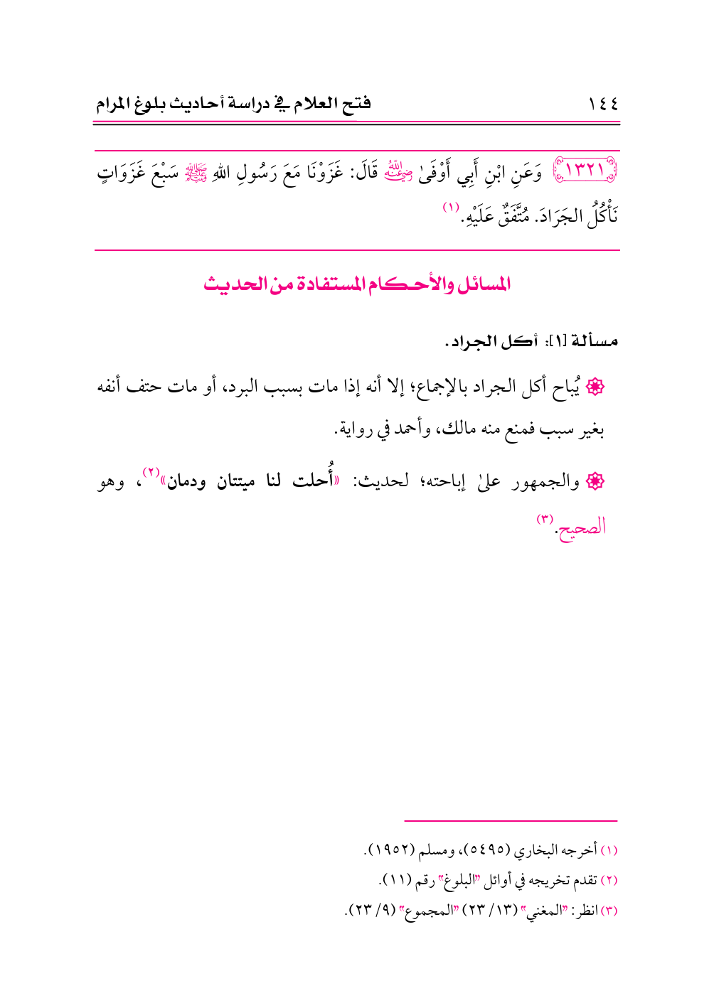 ١٣٢١ - وَعَنِ ابْنِ أَبِي أَوْفَى -رضي الله عنه- قَالَ: غَزَوْنَا مَعَ رَسُولِ اللهِ - صلى الله عليه وسلم - سَبْعَ غَزَوَاتٍ نَأْكُلُ الجَرَادَ. مُتَّفَقٌ عَلَيْهِ. (¬١)