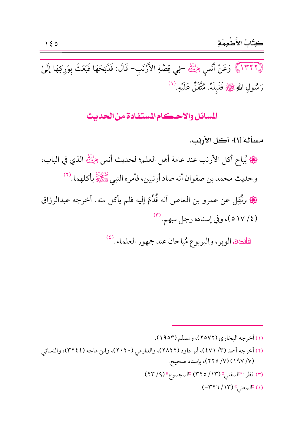 ١٣٢٢ - وَعَنْ أَنَسٍ -رضي الله عنه- -فِي قِصَّةِ الأَرْنَبِ- قَالَ: فَذَبَحَهَا فَبَعَثَ بِوَرِكِهَا إلَى رَسُولِ اللهِ - صلى الله عليه وسلم - فَقَبِلَهُ. مُتَّفَقٌ عَلَيْهِ. (¬١)