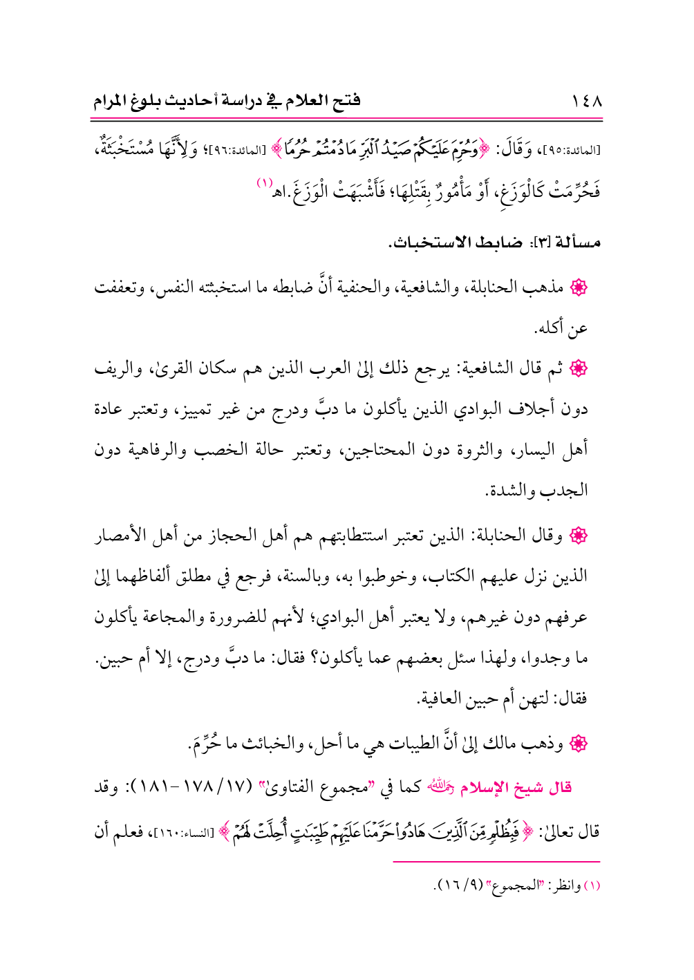 • وقال الحنابلة: الذين تعتبر استتطابتهم هم أهل الحجاز من أهل الأمصار الذين نزل عليهم الكتاب، وخوطبوا به، وبالسنة، فرجع في مطلق ألفاظهما إلى عرفهم دون غيرهم، ولا يعتبر أهل البوادي؛ لأنهم للضرورة والمجاعة يأكلون ما وجدوا، ولهذا سئل بعضهم عما يأكلون؟ فقال: ما دبَّ ودرج، إلا أم حبين. فقال: لتهن أم حبين العافية.