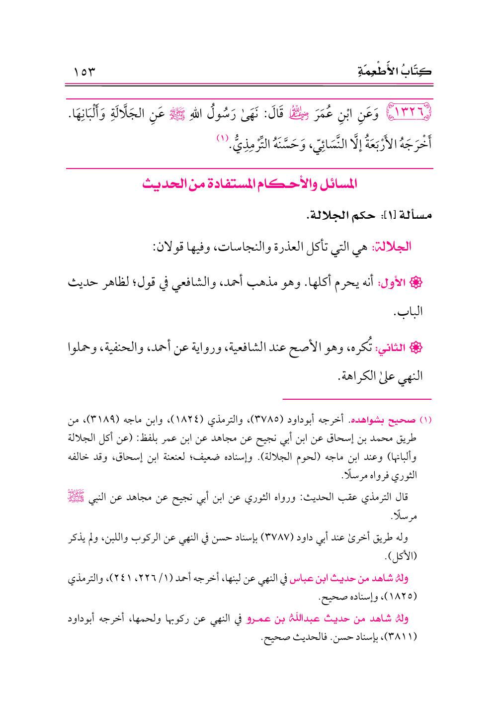 ١٣٢٦ - وَعَنِ ابْنِ عُمَرَ -رضي الله عنهما- قَالَ: نَهَى رَسُولُ اللهِ - صلى الله عليه وسلم - عَنِ الجَلَّالَةِ وَأَلْبَانِهَا. أَخْرَجَهُ الأَرْبَعَةُ إلَّا النَّسَائِيّ، وَحَسَّنَهُ التِّرْمِذِيُّ. (¬١)
