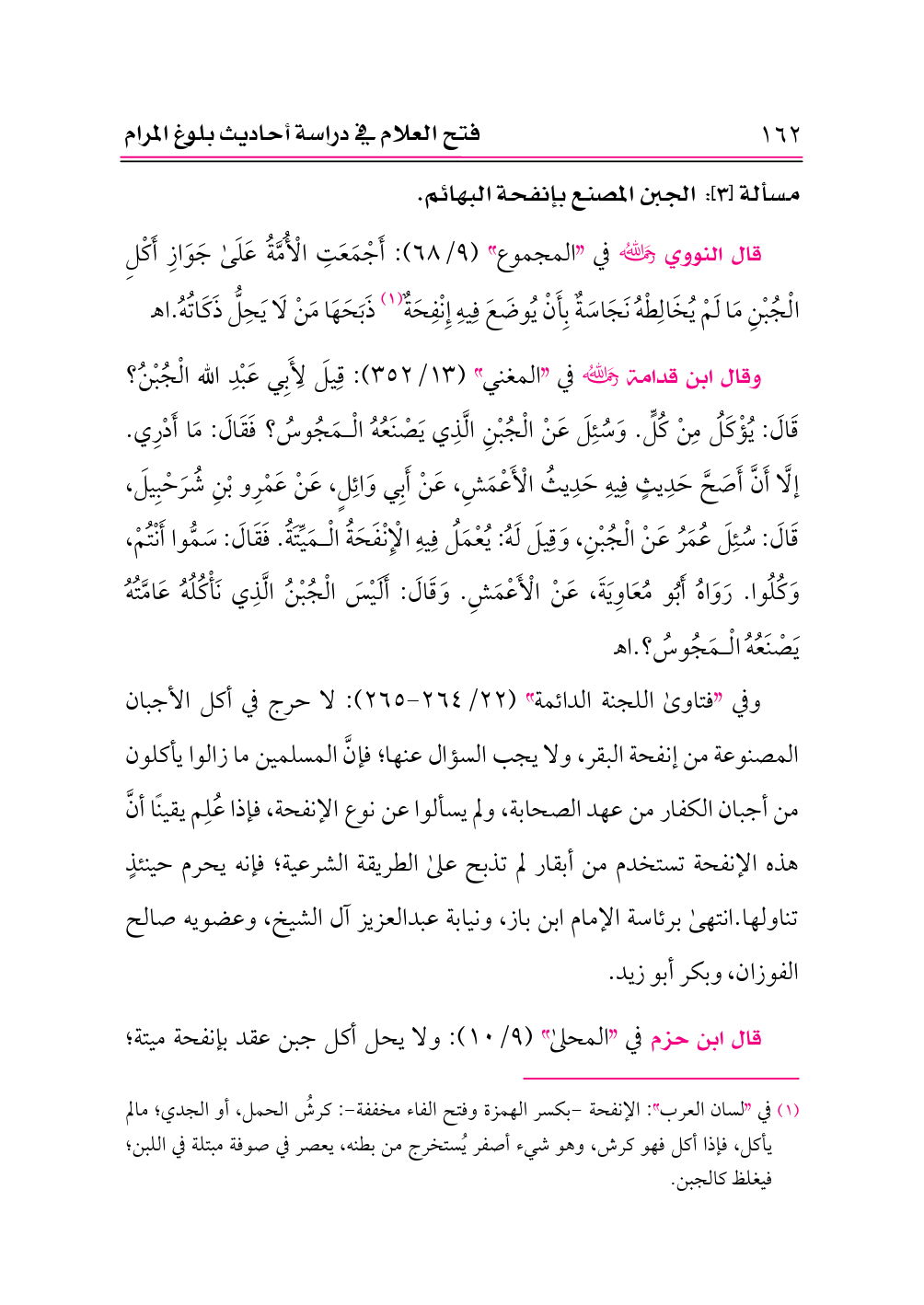 وفي «فتاوى اللجنة الدائمة» (٢٢/ ٢٦٤ - ٢٦٥): لا حرج في أكل الأجبان المصنوعة من إنفحة البقر، ولا يجب السؤال عنها؛ فإنَّ المسلمين ما زالوا يأكلون من أجبان الكفار من عهد الصحابة، ولم يسألوا عن نوع الإنفحة، فإذا عُلِم يقينًا أنَّ هذه الإنفحة تستخدم من أبقار لم تذبح على الطريقة الشرعية؛ فإنه يحرم حينئذٍ تناولها. انتهى برئاسة الإمام ابن باز، ونيابة عبدالعزيز آل الشيخ، وعضويه صالح الفوزان، وبكر أبو زيد.