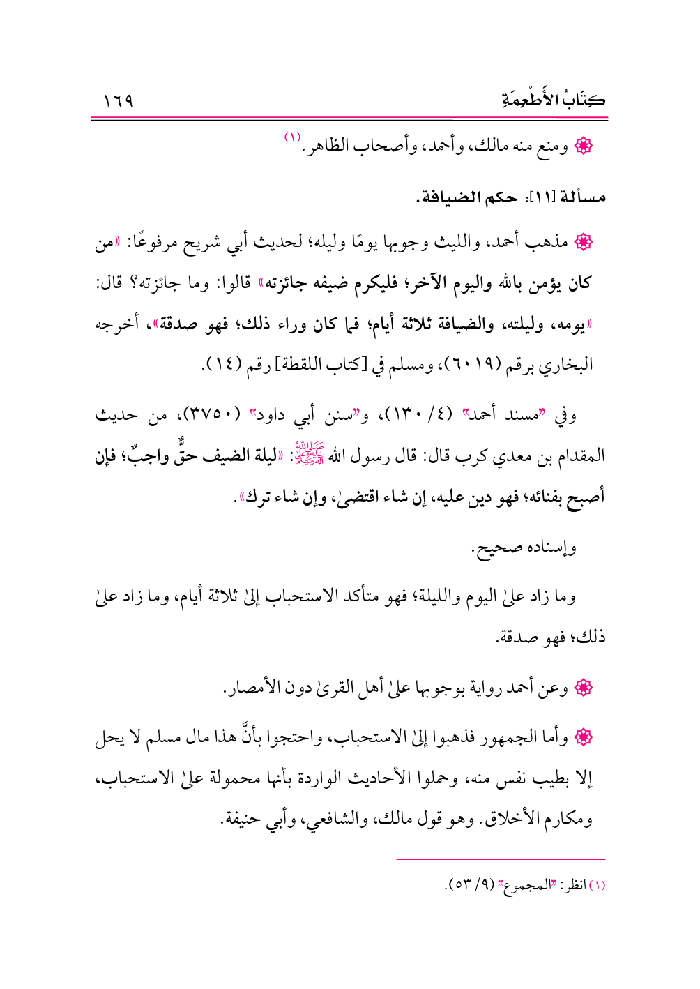 وفي «مسند أحمد» (٤/ ١٣٠)، و «سنن أبي داود» (٣٧٥٠)، من حديث المقدام بن معدي كرب قال: قال رسول الله -صلى الله عليه وعلى آله وسلم-: «ليلة الضيف حقٌّ واجبٌ؛ فإن أصبح بفنائه؛ فهو دين عليه، إن شاء اقتضى، وإن شاء ترك».