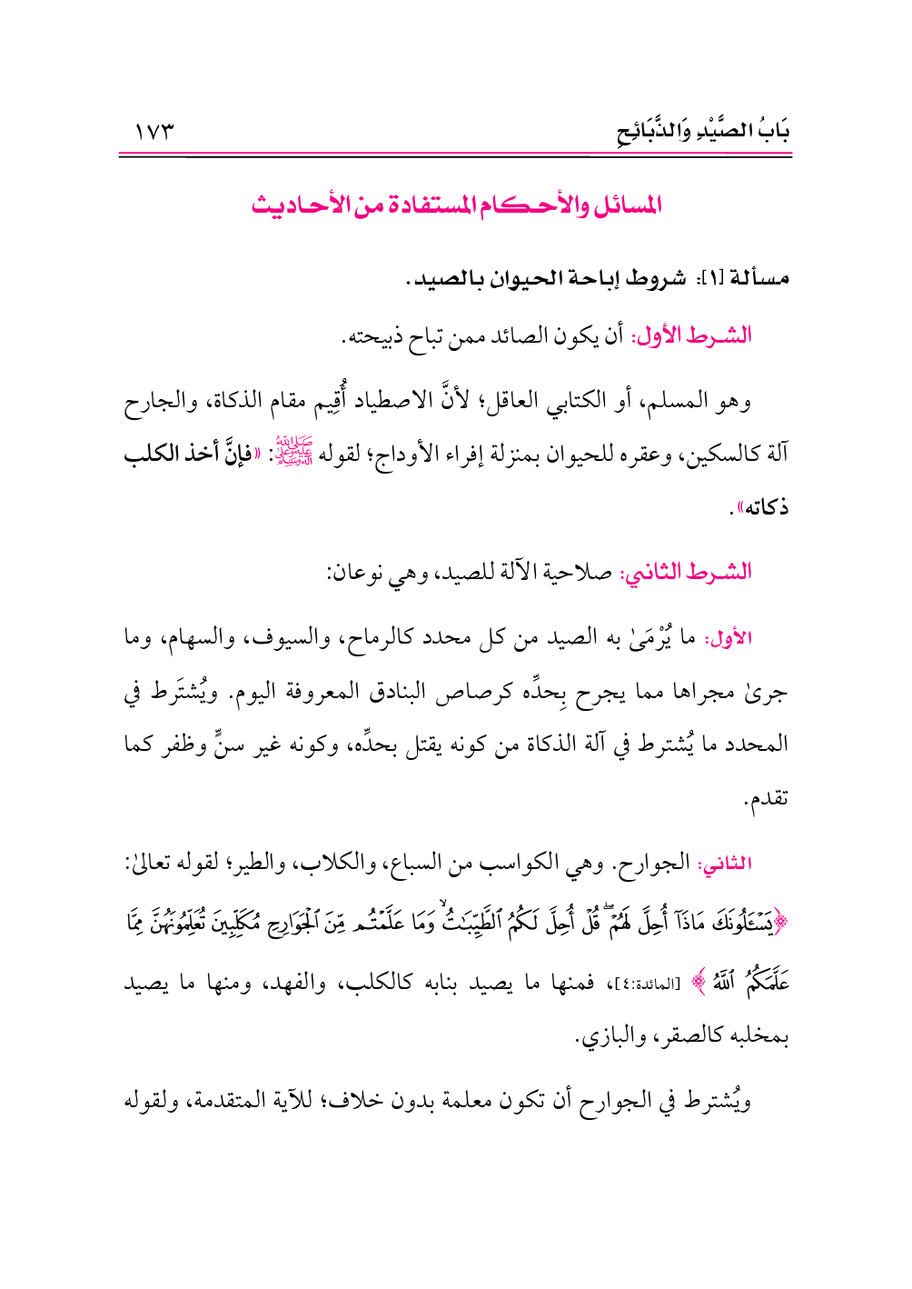 مسألة [١]: شروط إباحة الحيوان بالصيد.
