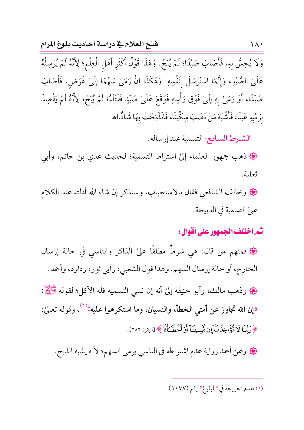 • فمنهم من قال: هي شرطٌ مطلقًا على الذاكر والناسي في حالة إرسال الجارح، أو حالة إرسال السهم. وهذا قول الشعبي، وأبي ثور، وداود، وأحمد.