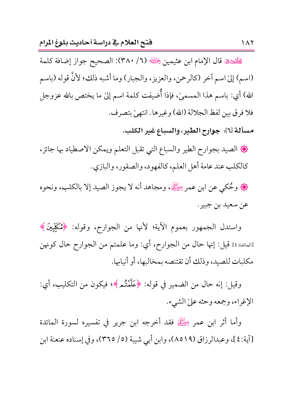 فائدة: قال الإمام ابن عثيمين -رحمه الله- (٦/ ٣٨٠): الصحيح جواز إضافة كلمة (اسم) إلى اسم آخر (كالرحمن، والعزيز، والجبار) وما أشبه ذلك؛ لأنَّ قوله (باسم الله) أي: باسم هذا المسمى، فإذا أُضيفت كلمة اسم إلى ما يختص بالله عزوجل فلا فرق بين لفظ الجلالة (الله) وغيرها. انتهى بتصرف.