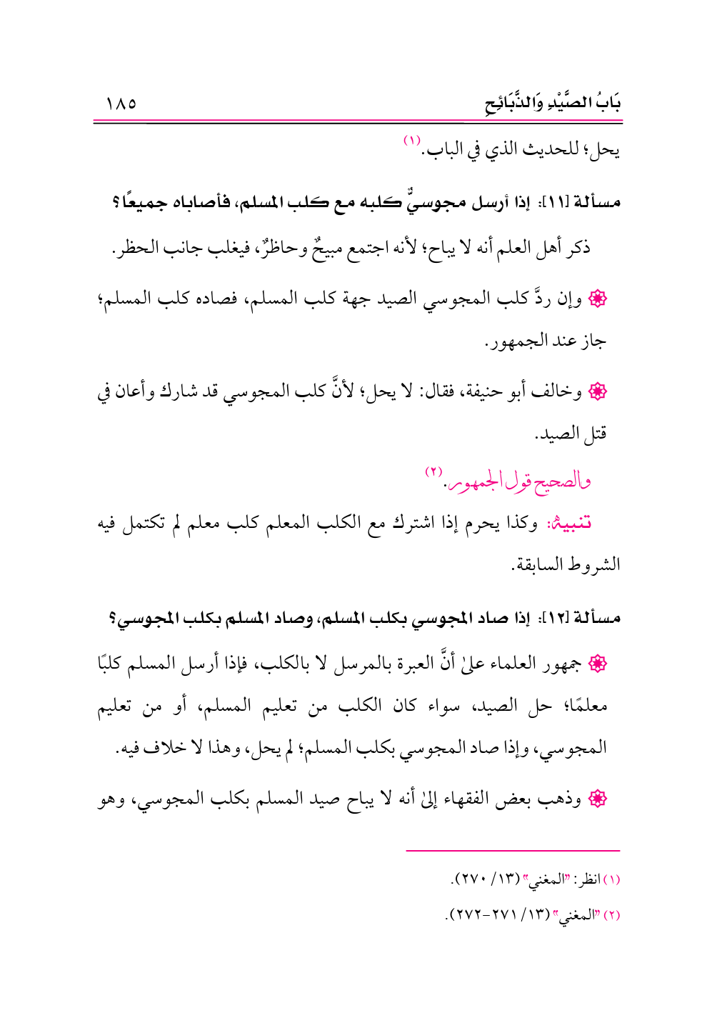 مسألة [١١]: إذا أرسل مجوسيٌّ كلبه مع كلب المسلم، فأصاباه جميعًا؟