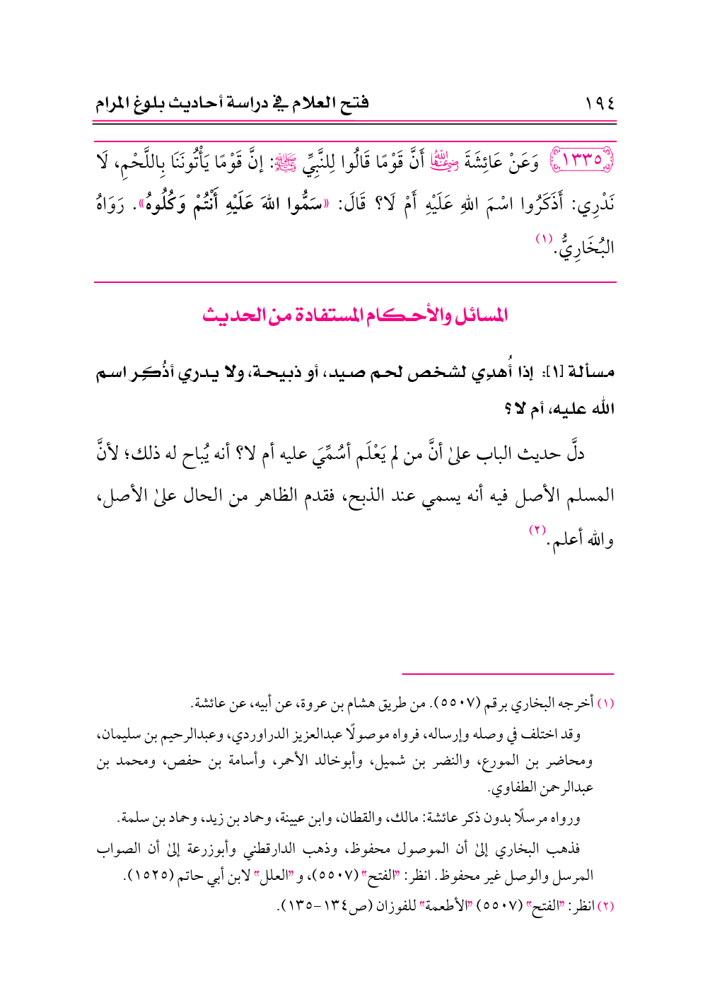 ١٣٣٥ - وَعَنْ عَائِشَةَ -رضي الله عنها- أَنَّ قَوْمًا قَالُوا لِلنَّبِيِّ - صلى الله عليه وسلم -: إنَّ قَوْمًا يَأْتُونَنَا بِاللَّحْمِ، لَا نَدْرِي: أَذَكَرُوا اسْمَ اللهِ عَلَيْهِ أَمْ لَا؟ قَالَ: «سَمُّوا اللهَ عَلَيْهِ أَنْتُمْ وَكُلُوهُ». رَوَاهُ البُخَارِيُّ. (¬١)