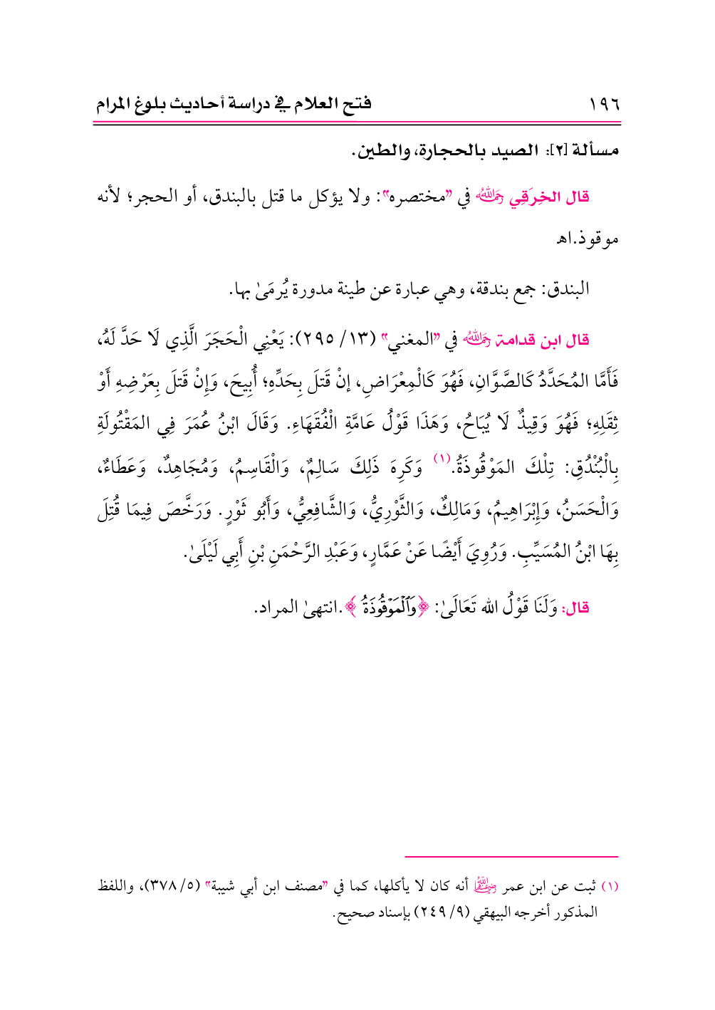 قال ابن قدامة -رحمه الله- في «المغني» (١٣/ ٢٩٥): يَعْنِي الْحَجَرَ الَّذِي لَا حَدَّ لَهُ، فَأَمَّا المُحَدَّدُ كَالصَّوَّانِ، فَهُوَ كَالْمِعْرَاضِ، إنْ قَتلَ بِحَدِّهِ؛ أُبِيحَ، وَإِنْ قَتلَ بِعَرْضِهِ أَوْ ثِقَلِهِ؛ فَهُوَ وَقِيذٌ لَا يُبَاحُ، وَهَذَا قَوْلُ عَامَّةِ الْفُقَهَاءِ. وَقَالَ ابْنُ عُمَرَ فِي المَقْتُولَةِ بِالْبُنْدُقِ: تِلْكَ المَوْقُوذَةُ. (¬١) وَكَرِهَ ذَلِكَ سَالِمٌ، وَالْقَاسِمُ، وَمُجَاهِدٌ، وَعَطَاءٌ، وَالْحَسَنُ، وَإِبْرَاهِيمُ، وَمَالِكٌ، وَالثَّوْرِيُّ، وَالشَّافِعِيُّ، وَأَبُو ثَوْرٍ. وَرَخَّصَ فِيمَا قُتِلَ بِهَا ابْنُ المُسَيِّبِ. وَرُوِيَ أَيْضًا عَنْ عَمَّارٍ، وَعَبْدِ الرَّحْمَنِ بْنِ أَبِي لَيْلَى.