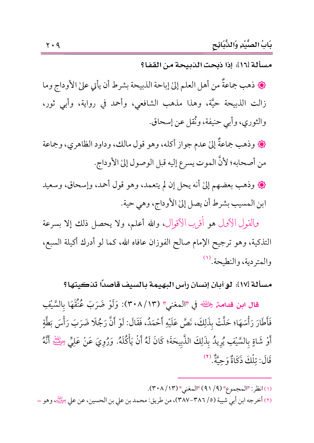 والقول الأول هو أقرب الأقوال، والله أعلم، ولا يحصل ذلك إلا بسرعة التذكية، وهو ترجيح الإمام صالح الفوزان عافاه الله، كما لو أدرك أكيلة السبع، والمتردية، والنطيحة. (¬١)