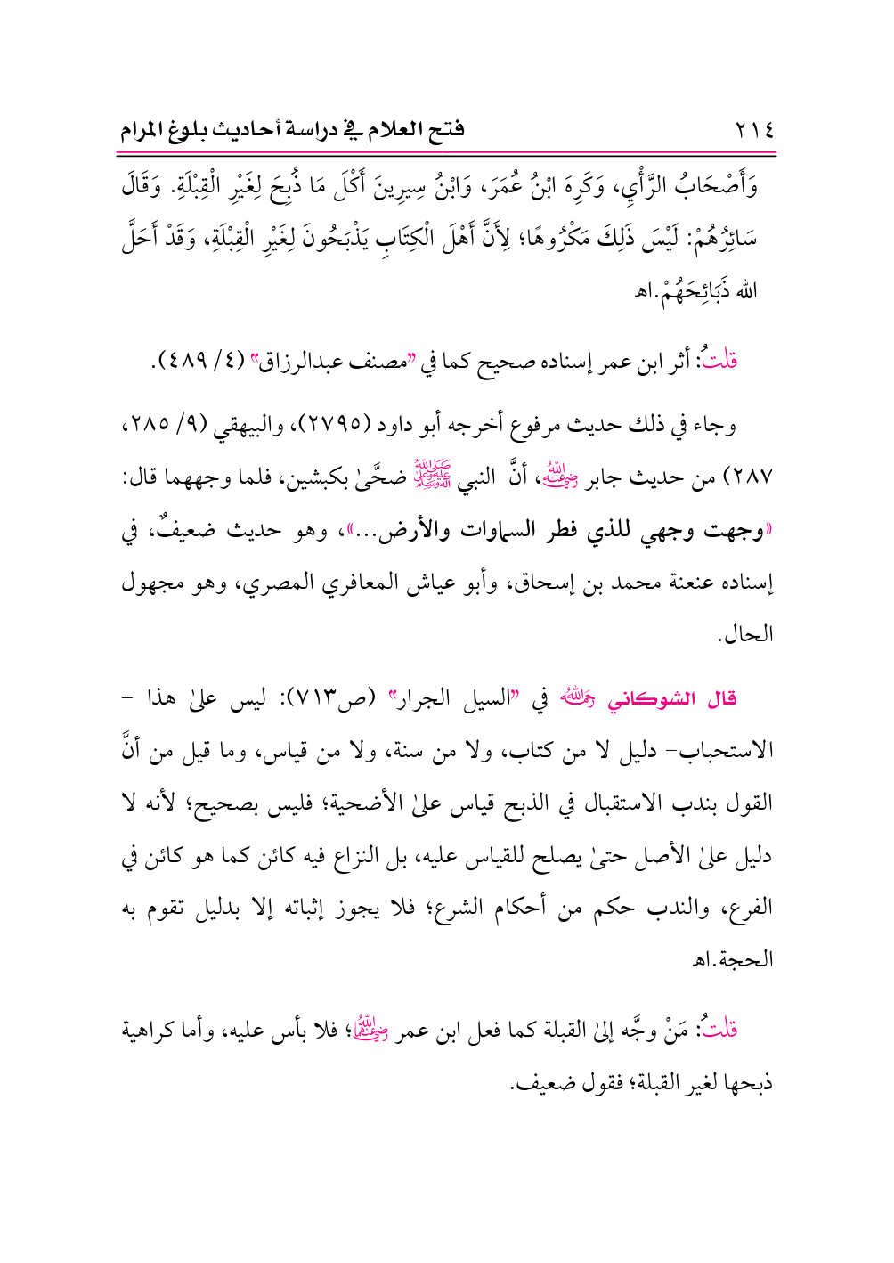 قلتُ: مَنْ وجَّه إلى القبلة كما فعل ابن عمر -رضي الله عنهما-؛ فلا بأس عليه، وأما كراهية ذبحها لغير القبلة؛ فقول ضعيف.