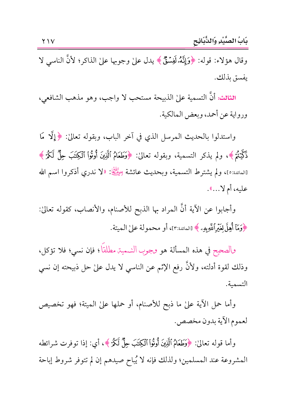 الثالث: أنَّ التسمية على الذبيحة مستحب لا واجب، وهو مذهب الشافعي، ورواية عن أحمد، وبعض المالكية.