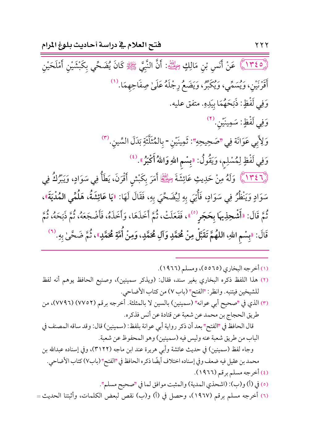 ١٣٤٥ - عَنْ أَنَسِ بْنِ مَالِكٍ -رضي الله عنه-: أَنَّ النَّبِيَّ - صلى الله عليه وسلم - كَانَ يُضَحِّي بِكَبْشَيْنِ أَمْلَحَيْنِ أَقَرْنَيْنِ، وَيُسَمِّي، وَيُكَبِّرُ، وَيَضَعُ رِجْلَهُ عَلَى صِفَاحِهِمَا. (¬١)