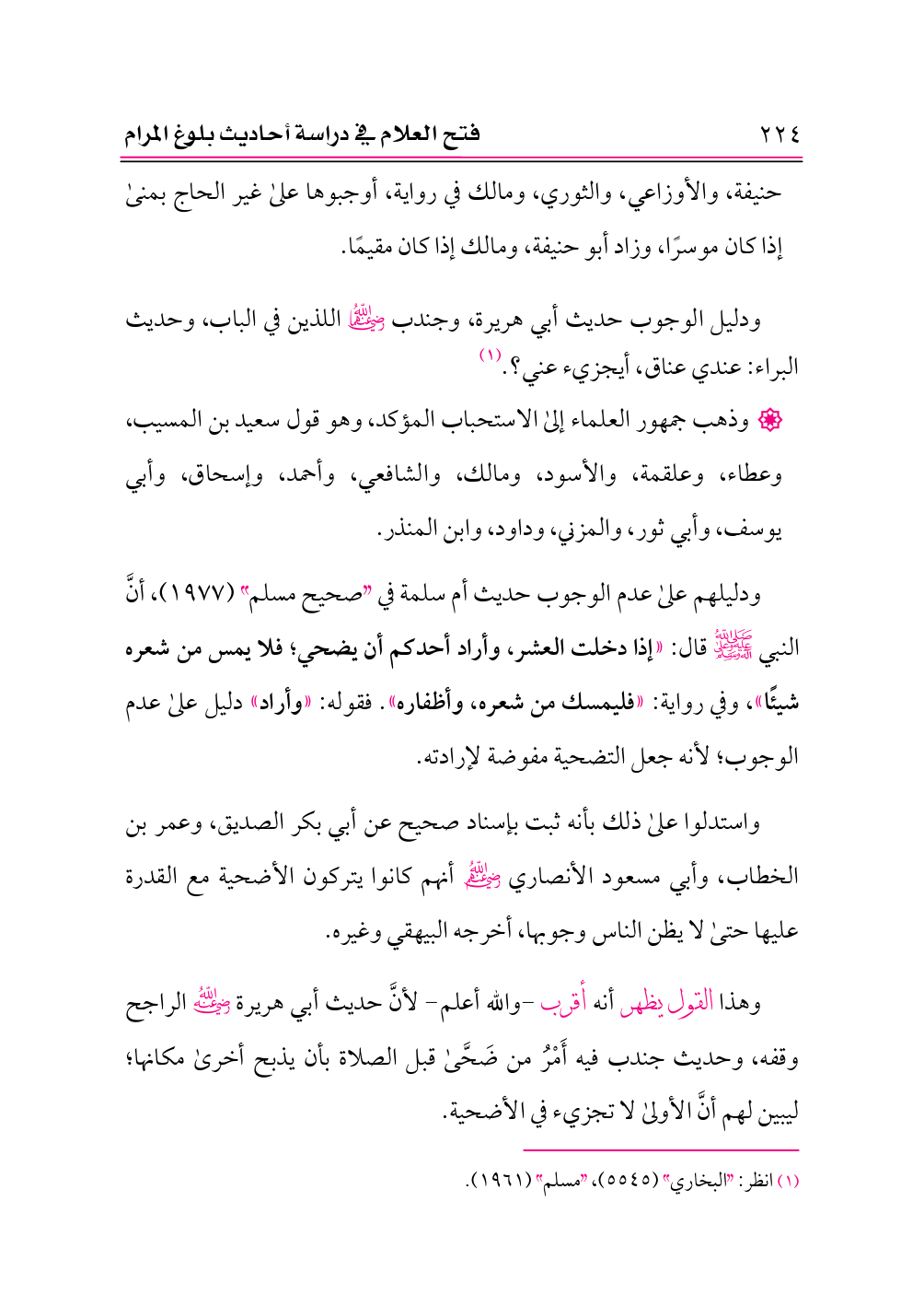 ودليلهم على عدم الوجوب حديث أم سلمة في «صحيح مسلم» (١٩٧٧)، أنَّ النبي -صلى الله عليه وعلى آله وسلم- قال: «إذا دخلت العشر، وأراد أحدكم أن يضحي؛ فلا يمس من شعره شيئًا»، وفي رواية: «فليمسك من شعره، وأظفاره». فقوله: «وأراد» دليل على عدم الوجوب؛ لأنه جعل التضحية مفوضة لإرادته.