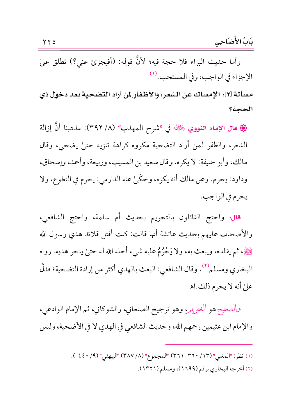 • قال الإمام النووي -رحمه الله- في «شرح المهذب» (٨/ ٣٩٢): مذهبنا أنَّ إزالة الشعر، والظفر لمن أراد التضحية مكروه كراهة تنزيه حتى يضحي، وقال مالك، وأبو حنيفة: لا يكره. وقال سعيد بن المسيب، وربيعة، وأحمد، وإسحاق، وداود: يحرم. وعن مالك أنه يكره، وحكَى عنه الدارمي: يحرم في التطوع، ولا يحرم في الواجب.