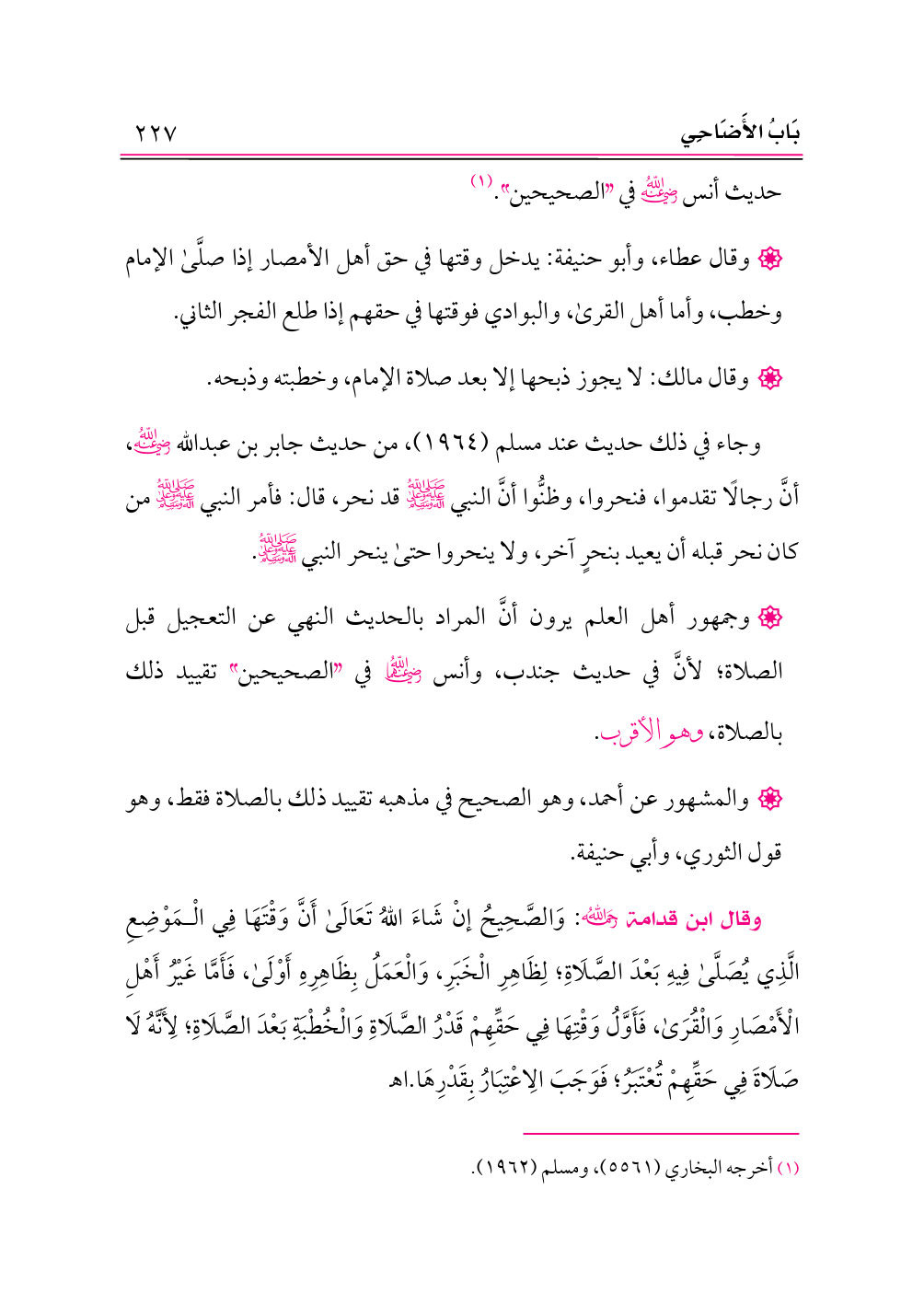• وقال مالك: لا يجوز ذبحها إلا بعد صلاة الإمام، وخطبته وذبحه.