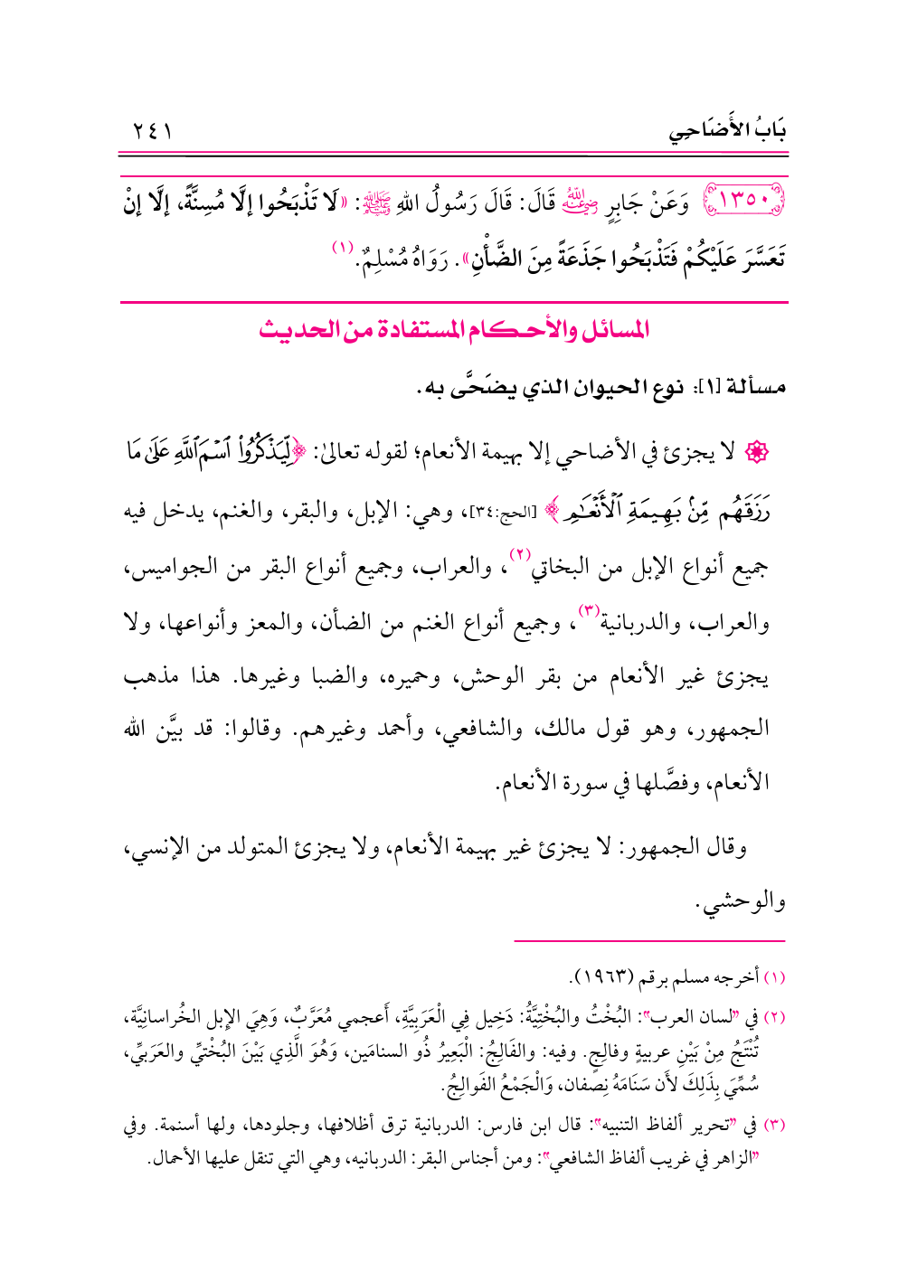 ١٣٥٠ - وَعَنْ جَابِرٍ -رضي الله عنه- قَالَ: قَالَ رَسُولُ اللهِ - صلى الله عليه وسلم -: «لَا تَذْبَحُوا إلَّا مُسِنَّةً، إلَّا إنْ تَعَسَّرَ عَلَيْكُمْ فَتَذْبَحُوا جَذَعَةً مِنَ الضَّأْنِ». رَوَاهُ مُسْلِمٌ. (¬١)