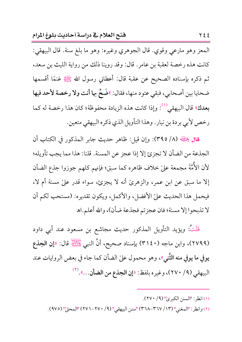 قلتُ: ويؤيد التأويل المذكور حديث مجاشع بن مسعود عند أبي داود (٢٧٩٩)، وابن ماجه (٣١٤٠) بإسناد صحيح، أنَّ النبي -صلى الله عليه وعلى آله وسلم- قال: «إن الجذع يوفي ما يوفي منه الثَّني»، وهو محمول على الضأن كما جاء في بعض الروايات عند البيهقي (٩/ ٢٧٠)، وغيره بلفظ: «إن الجذع من الضأن ... ». (¬٢)