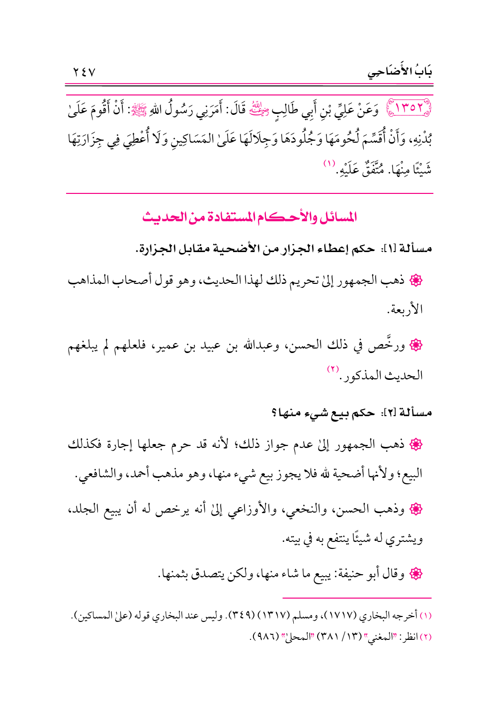 ١٣٥٢ - وَعَنْ عَلِيِّ بْنِ أَبِي طَالِبٍ -رضي الله عنه- قَالَ: أَمَرَنِي رَسُولُ اللهِ - صلى الله عليه وسلم -: أَنْ أَقُومَ عَلَى بُدْنِهِ، وَأَنْ أُقَسِّمَ لُحُومَهَا وَجُلُودَهَا وَجِلَالَهَا عَلَى المَسَاكِينِ وَلَا أُعْطِيَ فِي جِزَارَتِهَا شَيْئًا مِنْهَا. مُتَّفَقٌ عَلَيْهِ. (¬١)