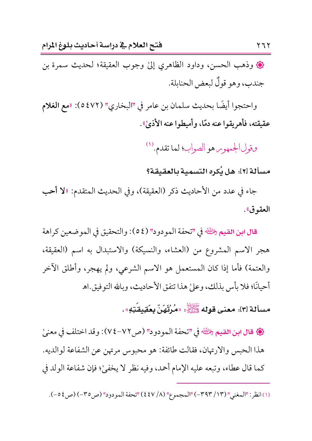 مسألة [٣]: معنى قوله -صلى الله عليه وعلى آله وسلم-: «مُرْتَهَنٌ بِعَقِيقَتِهِ».
