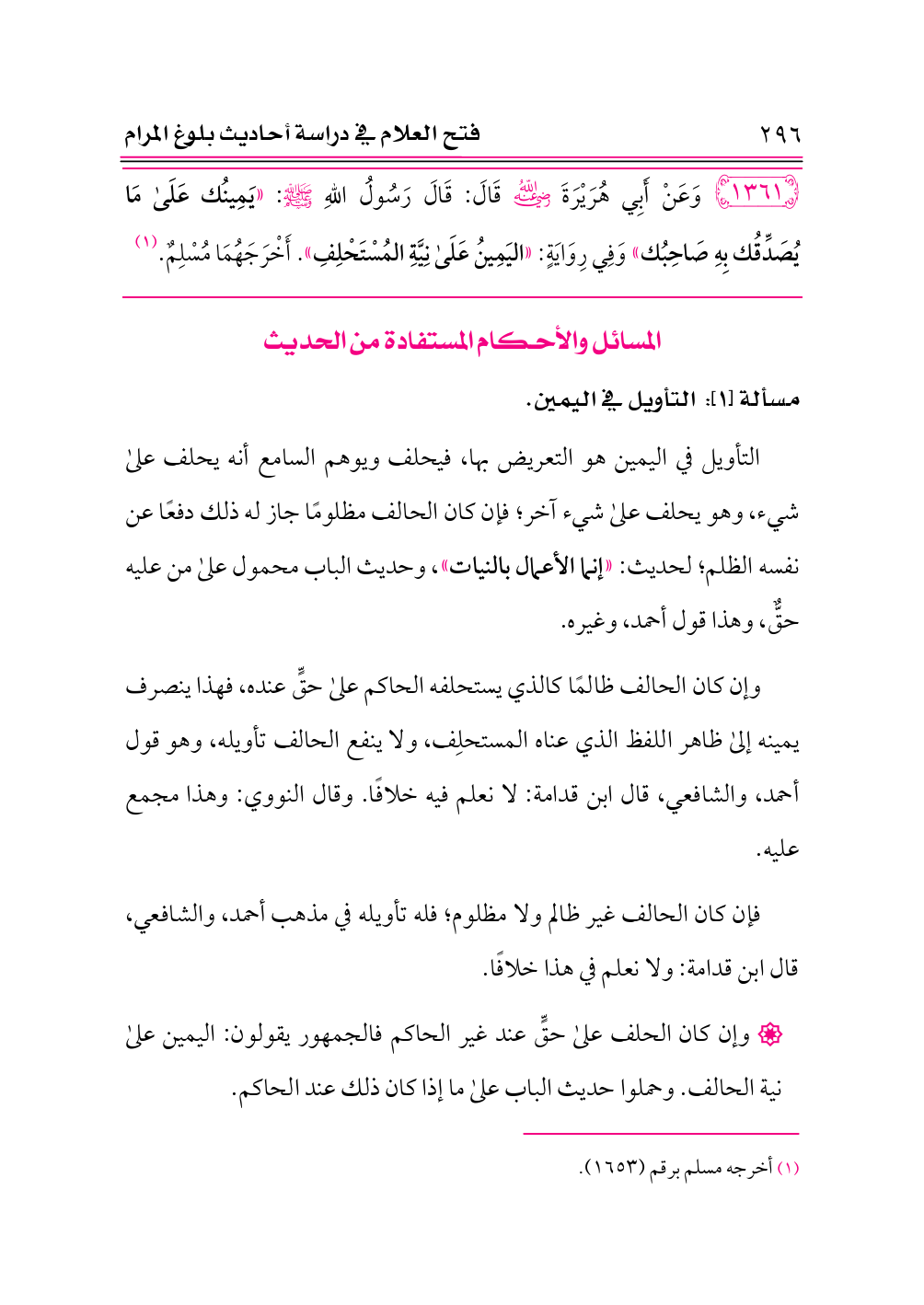 ١٣٦١ - وَعَنْ أَبِي هُرَيْرَةَ -رضي الله عنه- قَالَ: قَالَ رَسُولُ اللهِ - صلى الله عليه وسلم -: «يَمِينُك عَلَى مَا يُصَدِّقُك بِهِ صَاحِبُك» وَفِي رِوَايَةٍ: «اليَمِينُ عَلَى نِيَّةِ المُسْتَحْلِفِ». أَخْرَجَهُمَا مُسْلِمٌ. (¬١)