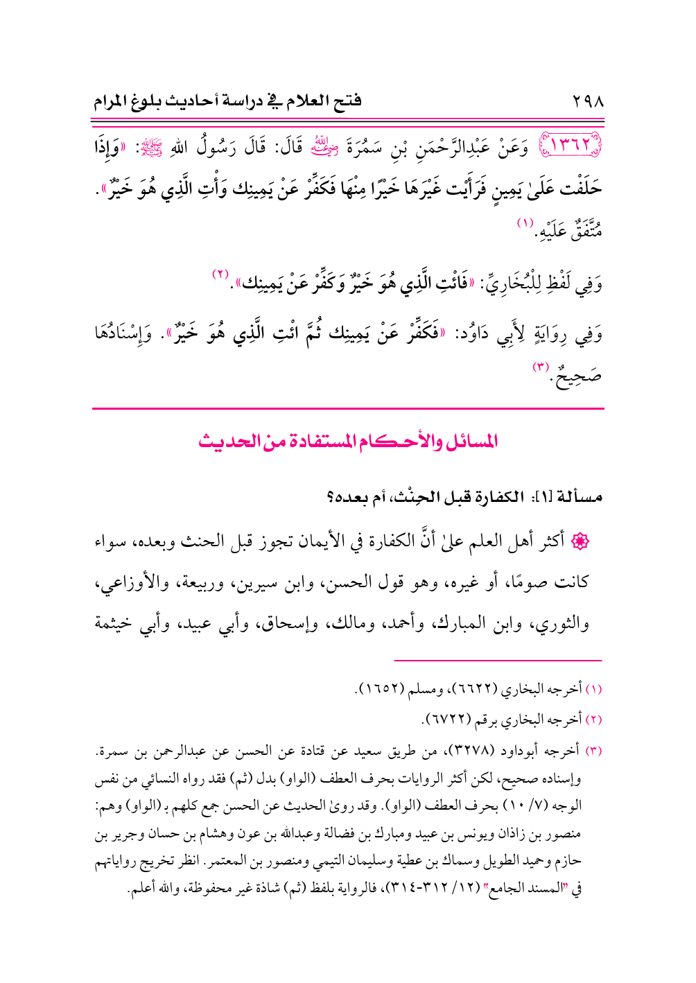 (¬٣) أخرجه أبوداود (٣٢٧٨)، من طريق سعيد عن قتادة عن الحسن عن عبدالرحمن بن سمرة. وإسناده صحيح، لكن أكثر الروايات بحرف العطف (الواو) بدل (ثم) فقد رواه النسائي من نفس الوجه (٧/ ١٠) بحرف العطف (الواو). وقد روى الحديث عن الحسن جمع كلهم ب (الواو) وهم: منصور بن زاذان ويونس بن عبيد ومبارك بن فضالة وعبدالله بن عون وهشام بن حسان وجرير بن حازم وحميد الطويل وسماك بن عطية وسليمان التيمي ومنصور بن المعتمر. انظر تخريج رواياتهم في «المسند الجامع» (١٢/ ٣١٢ - ٣١٤)، فالرواية بلفظ (ثم) شاذة غير محفوظة، والله أعلم.