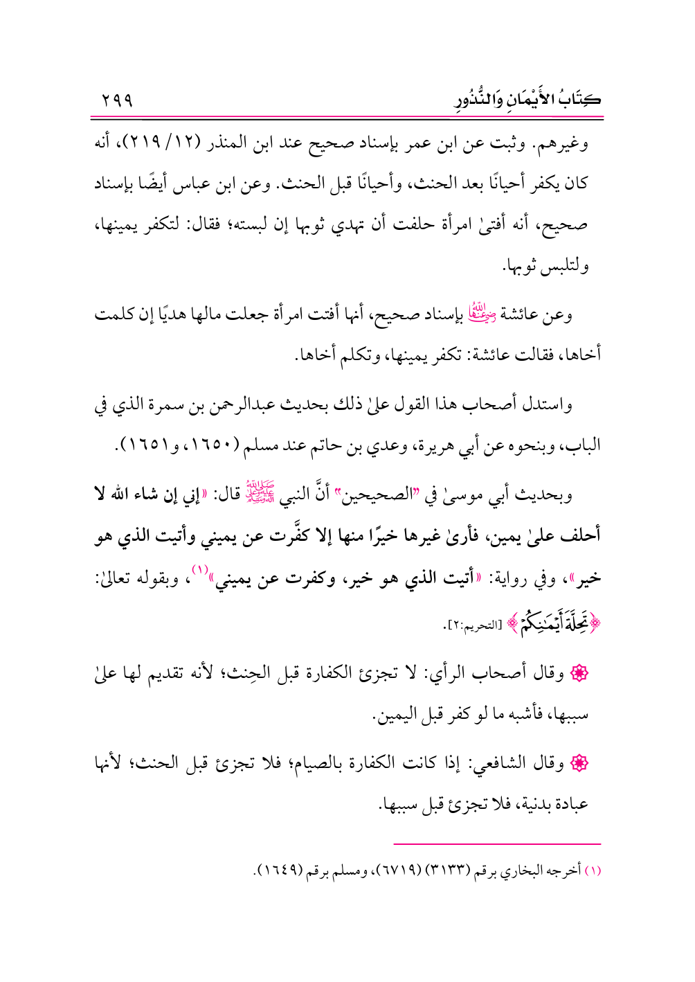 وبحديث أبي موسى في «الصحيحين» أنَّ النبي -صلى الله عليه وعلى آله وسلم- قال: «إني إن شاء الله لا أحلف على يمين، فأرى غيرها خيرًا منها إلا كفَّرت عن يميني وأتيت الذي هو خير»، وفي رواية: «أتيت الذي هو خير، وكفرت عن يميني» (¬١)، وبقوله تعالى: {تَحِلَّةَ أَيْمَانِكُمْ} [التحريم:٢].