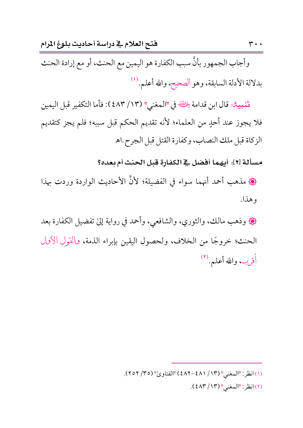 • وذهب مالك، والثوري، والشافعي، وأحمد في رواية إلى تفضيل الكفارة بعد الحنث؛ خروجًا من الخلاف، ولحصول اليقين بإبراء الذمة، والقول الأول أقرب، والله أعلم. (¬٢)