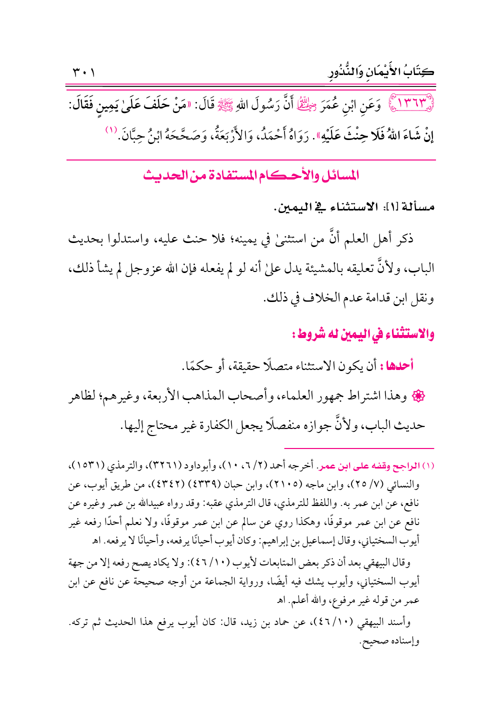 ١٣٦٣ - وَعَنِ ابْنِ عُمَرَ -رضي الله عنهما- أَنَّ رَسُولَ اللهِ - صلى الله عليه وسلم - قَالَ: «مَنْ حَلَفَ عَلَى يَمِينٍ فَقَالَ: إنْ شَاءَ اللهُ فَلَا حِنْثَ عَلَيْهِ». رَوَاهُ أَحْمَدُ، وَالأَرْبَعَةُ، وَصَحَّحَهُ ابْنُ حِبَّانَ. (¬١)
