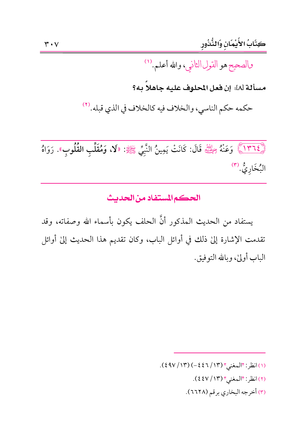 ١٣٦٤ - وَعَنْهُ -رضي الله عنه- قَالَ: كَانَتْ يَمِينُ النَّبِيِّ - صلى الله عليه وسلم -: «لَا، وَمُقَلِّبِ القُلُوبِ». رَوَاهُ البُخَارِيُّ. (¬٣)