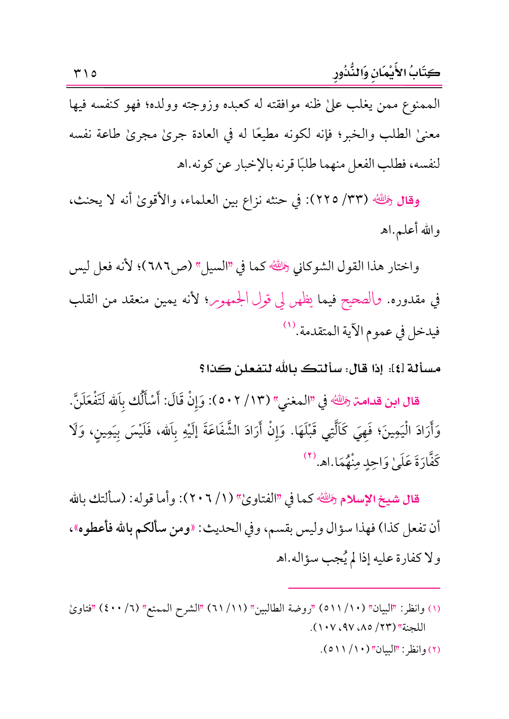 قال ابن قدامة -رحمه الله- في «المغني» (١٣/ ٥٠٢): وَإِنْ قَالَ: أَسْأَلُك بِاَلله لَتَفْعَلَنَّ. وَأَرَادَ الْيَمِينَ؛ فَهِيَ كَاَلَّتِي قَبْلَهَا. وَإِنْ أَرَادَ الشَّفَاعَةَ إلَيْهِ بِاَلله، فَلَيْسَ بِيَمِينٍ، وَلَا كَفَّارَةَ عَلَى وَاحِدٍ مِنْهُمَا. اهـ. (¬٢)