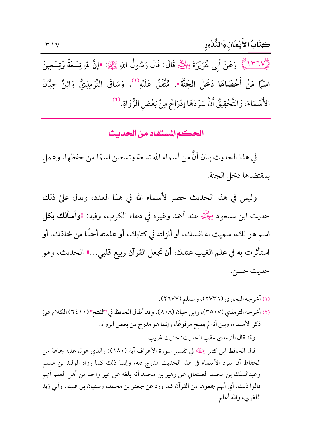 ١٣٦٧ - وَعَنْ أَبِي هُرَيْرَةَ -رضي الله عنه- قَالَ: قَالَ رَسُولُ اللهِ - صلى الله عليه وسلم -: «إنَّ للهِ تِسْعَةً وَتِسْعِينَ اسْمًا مَنْ أَحْصَاهَا دَخَلَ الجَنَّةَ». مُتَّفَقٌ عَلَيْهِ (¬١)، وَسَاقَ التِّرْمِذِيُّ وَابْنُ حِبَّانَ الأَسْمَاءَ، وَالتَّحْقِيقُ أَنَّ سَرْدَهَا إدْرَاجٌ مِنْ بَعْضِ الرُّوَاةِ. (¬٢)