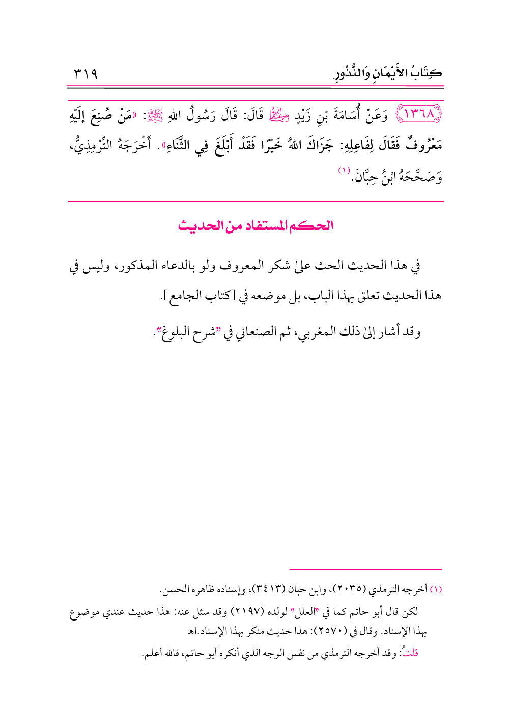 ١٣٦٨ - وَعَنْ أُسَامَةَ بْنِ زَيْدٍ -رضي الله عنهما- قَالَ: قَالَ رَسُولُ اللهِ - صلى الله عليه وسلم -: «مَنْ صُنِعَ إلَيْهِ مَعْرُوفٌ فَقَالَ لِفَاعِلِهِ: جَزَاكَ اللهُ خَيْرًا فَقَدْ أَبْلَغَ فِي الثَّنَاءِ». أَخْرَجَهُ التِّرْمِذِيُّ، وَصَحَّحَهُ ابْنُ حِبَّانَ. (¬١)